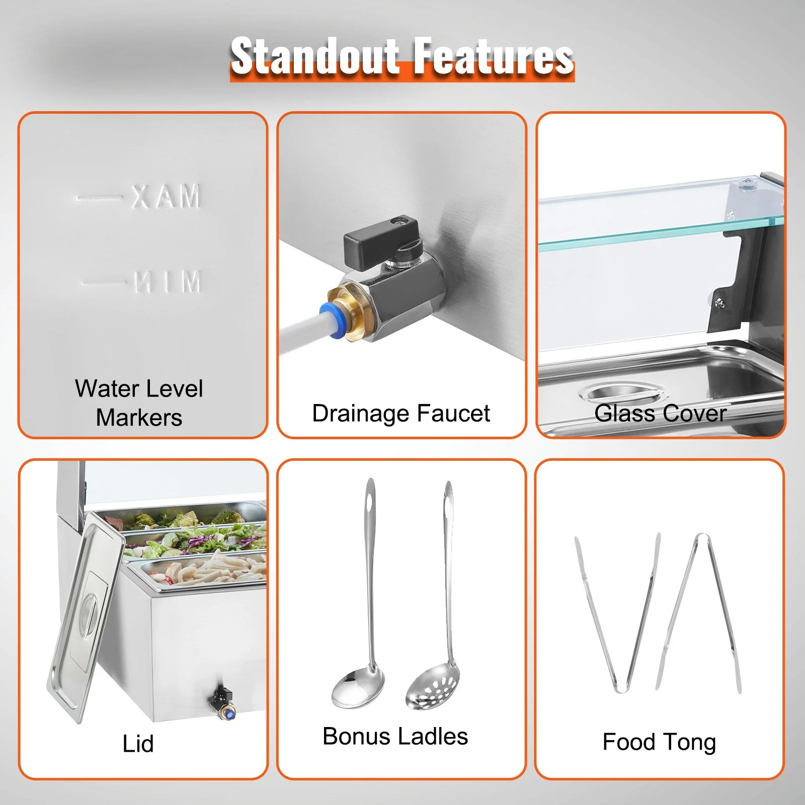 Our commercial food warmer comes with nine 5QT food pans (9*1/3-Size) accompanied by their respective lids, allowing you to serve different dishes simultaneously. Feel free to change up your menu from soups and sauces to stew, or even nacho cheese and chocolate.
