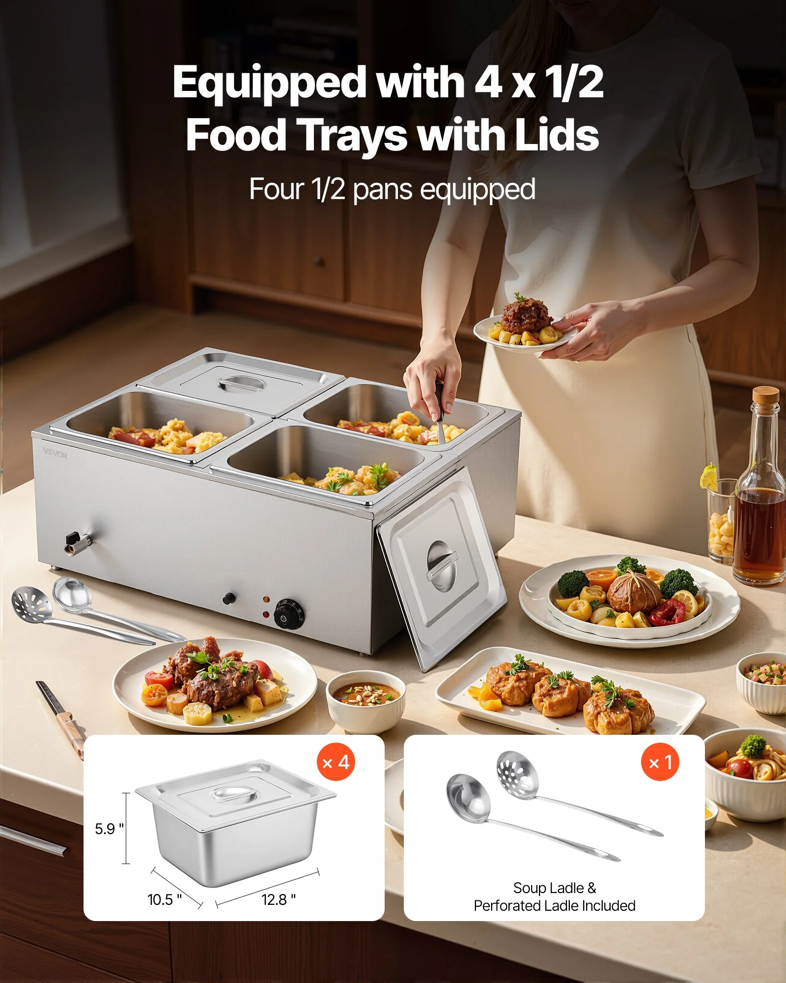 With a standard 5.9 in depth, this buffet bain marie comes with 4 x 1/2 size pans that fit all 5.9 in deep compartments. You can combine or swap them easily, creating menus from soups and sauces to stews, nacho cheese, or chocolate