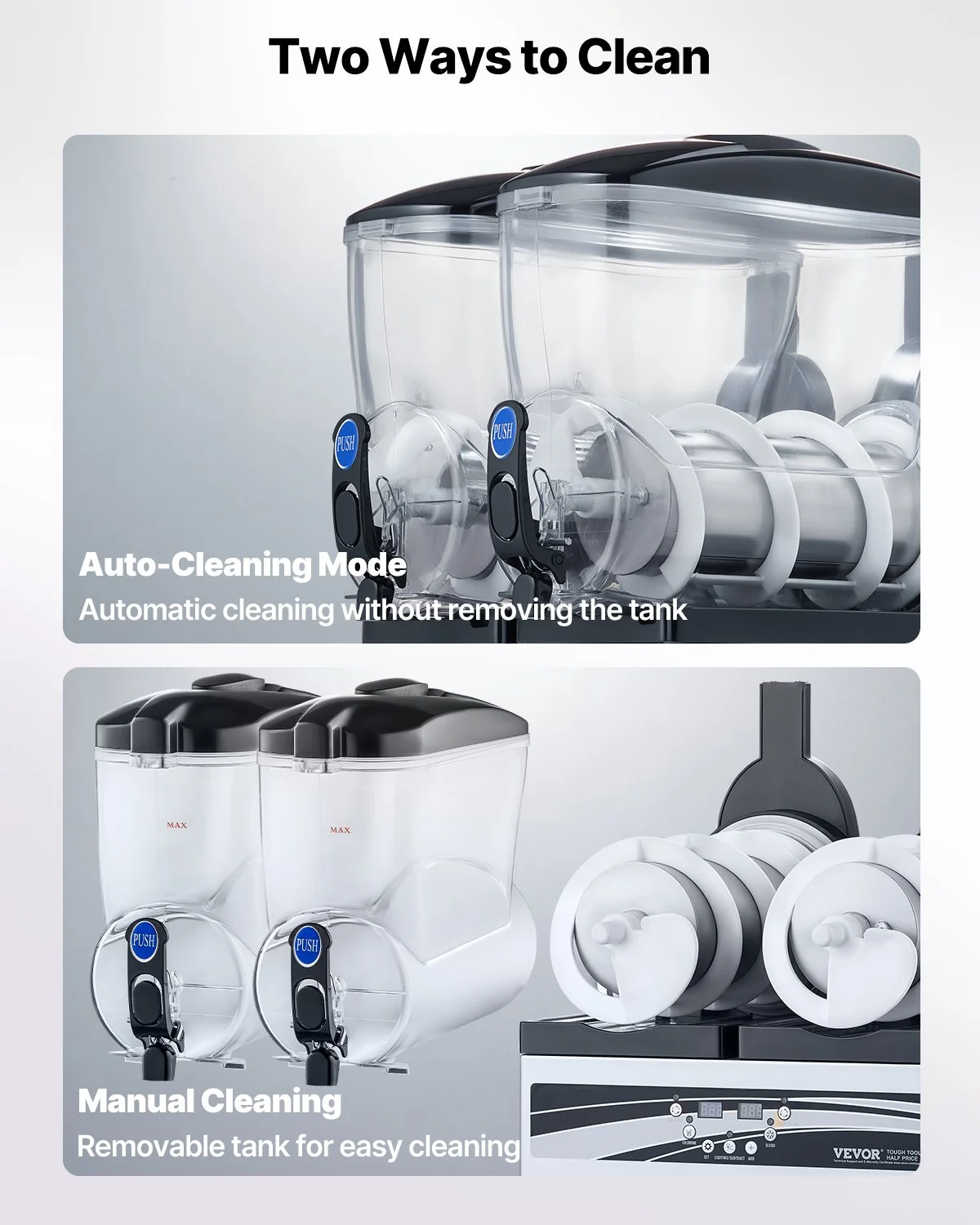 Made with a stainless steel body and food-grade PC tank, this commercial slushie machine is built to last and easy to clean. The tank features one-button automatic cleaning, and the modular components can be easily disassembled without tools for hassle-free maintenance and cleaning.