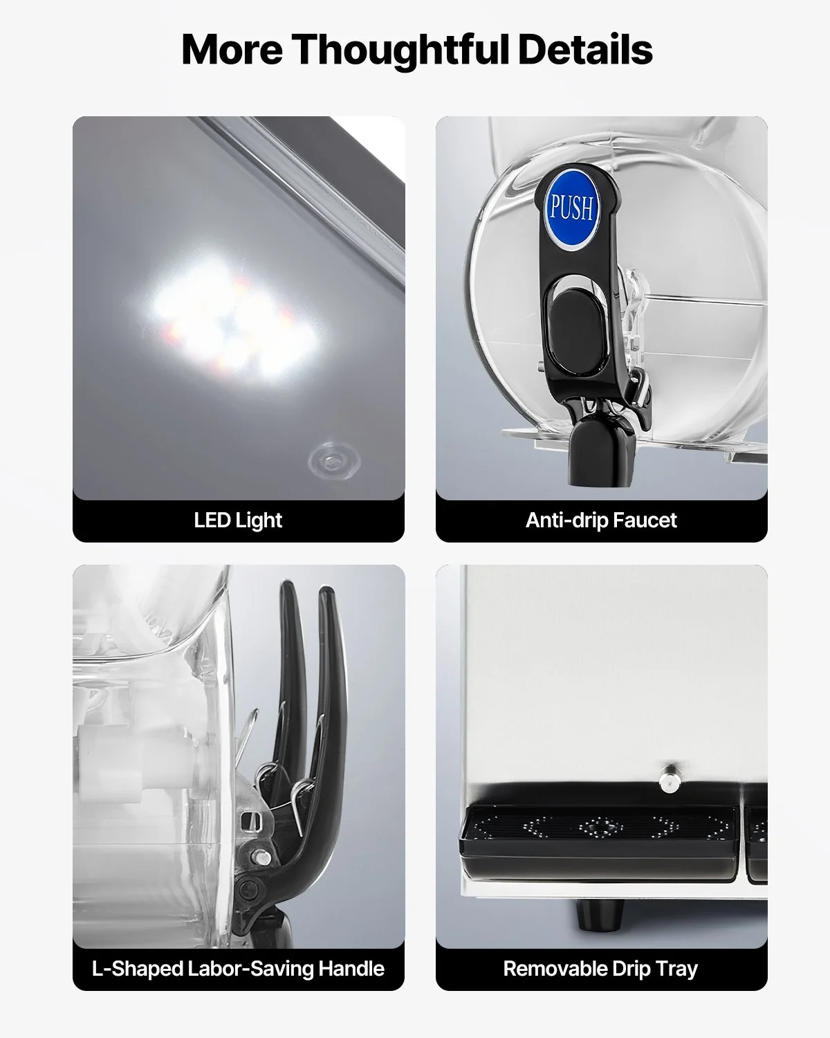 The slushy maker machine is equipped with a drip tray at the bottom to prevent water leakage, which can be removed for easy cleaning. The spring-loaded faucet ensures minimal water leakage after use. The three-sided ventilation design helps with quick heat dissipation, and the rubber feet provide non-slip stability during operation, ensuring better machine stability.