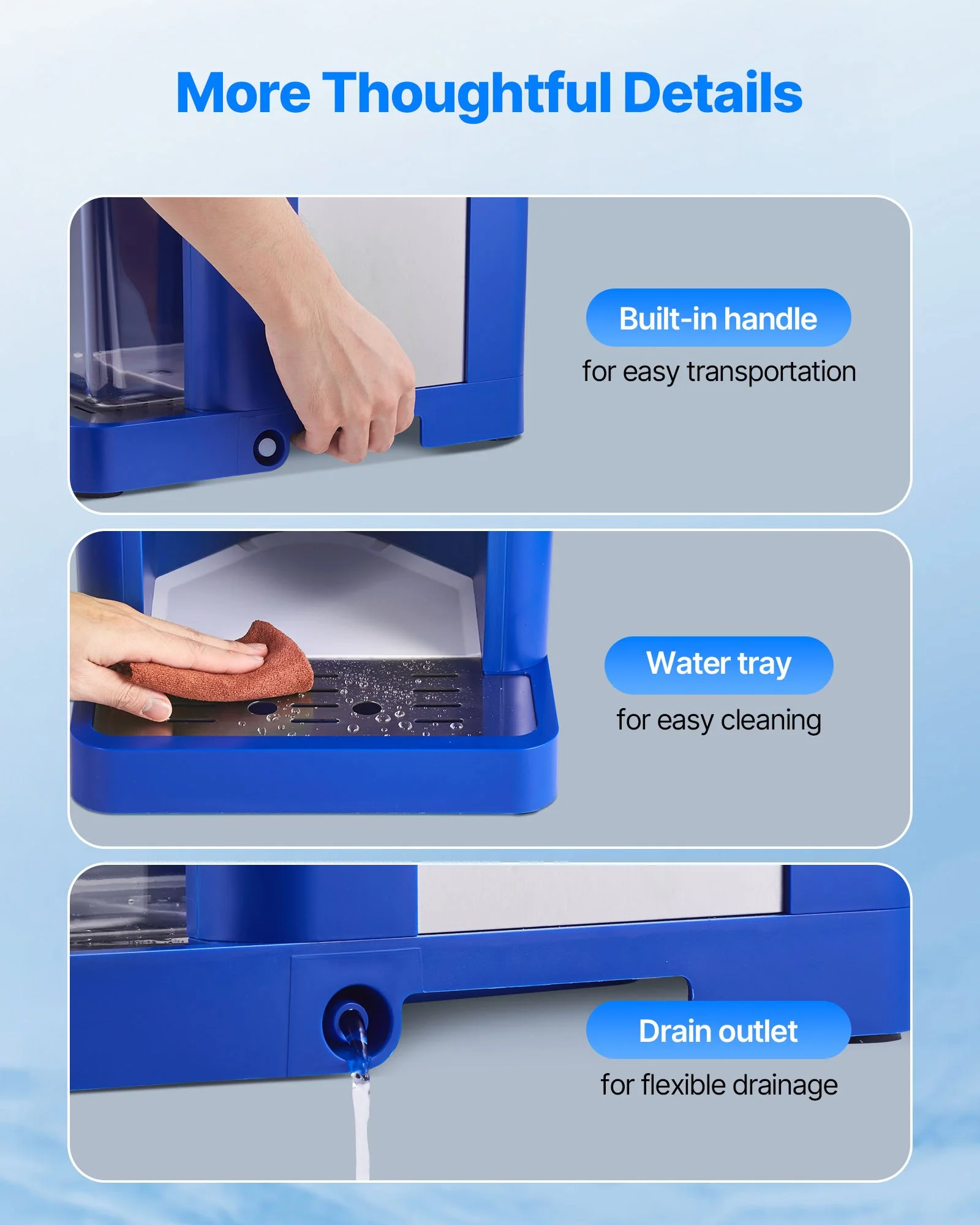 Built-in handle for easy portability, with a drip tray and drainage outlet for hassle-free cleaning. ideal for dessert shops, restaurants, parties, or home use