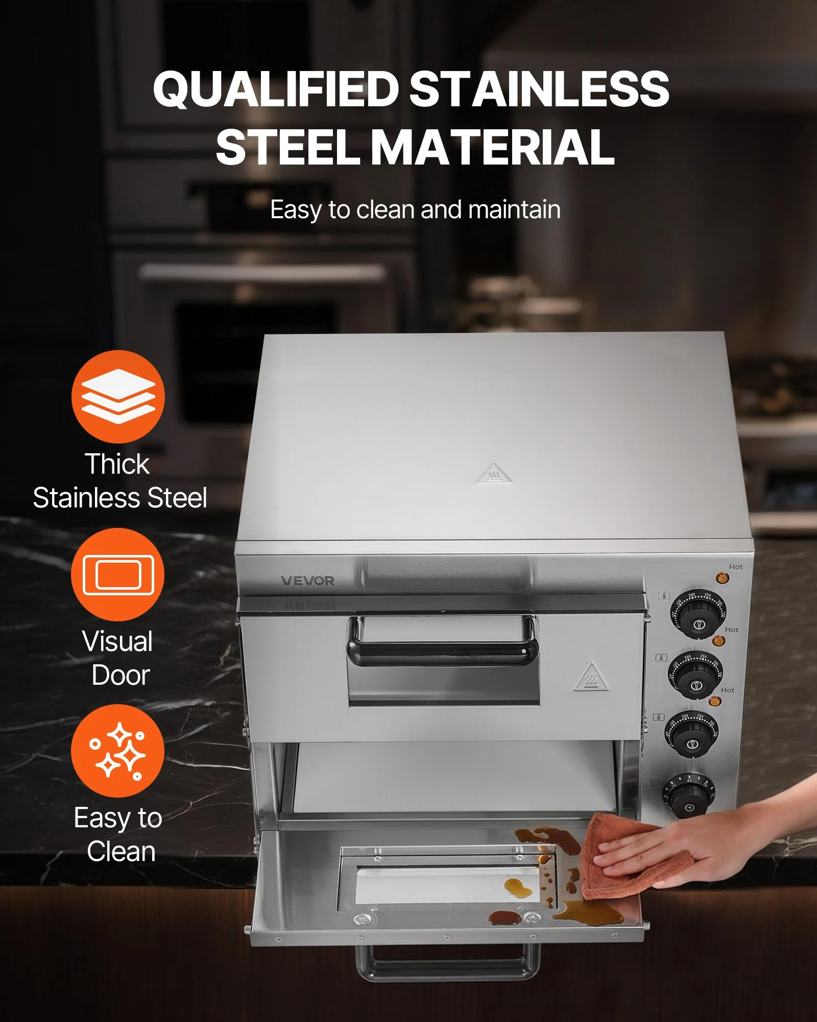 Crafted with food-grade stainless steel, VEVOR electric pizza oven assures you a secure and hassle-free baking experience. Coupled with the provided pizza stone and door handle, this countertop pizza oven is able to bake crispy pizzas up to 14 inches, perfect for your kitchen, dorm, camping, and parties.