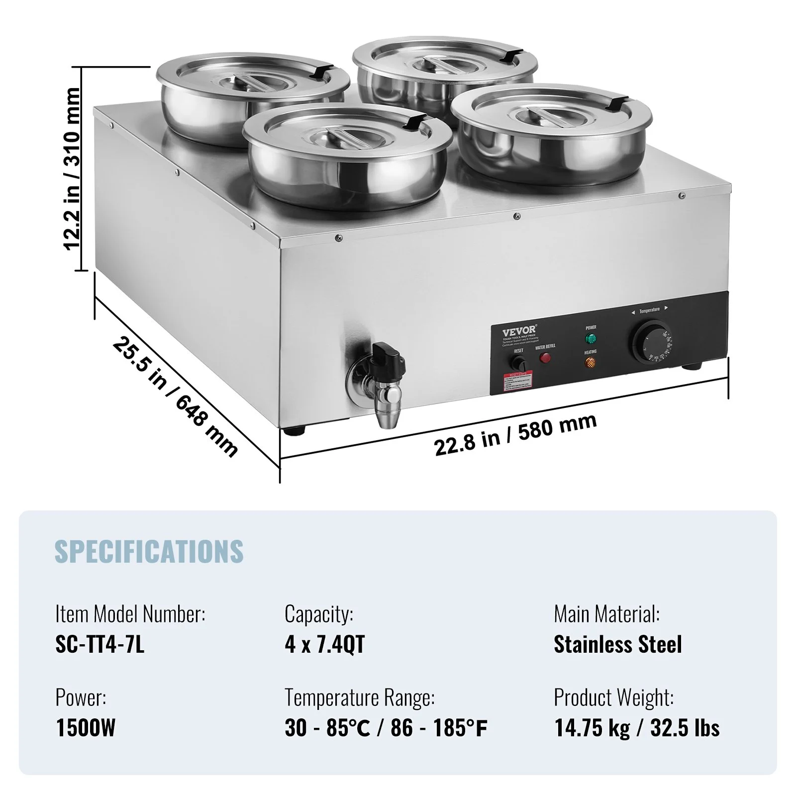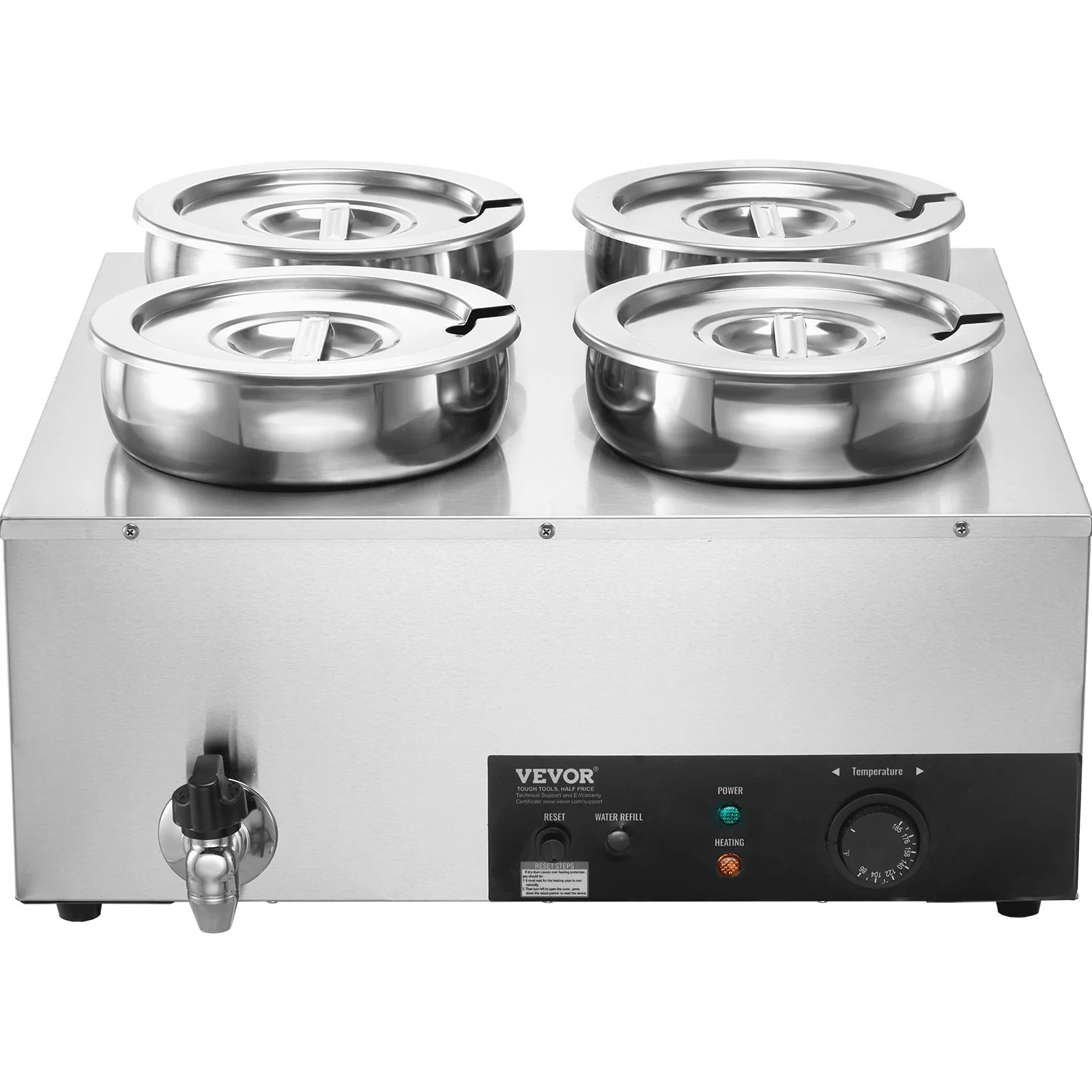 Our commercial soup warmer comes equipped with Four 7.4Qt round pots with their respective lids, allowing you to serve different dishes simultaneously. Feel free to change up your menu from soups and sauces to stew, or even nacho cheese and chocolate.