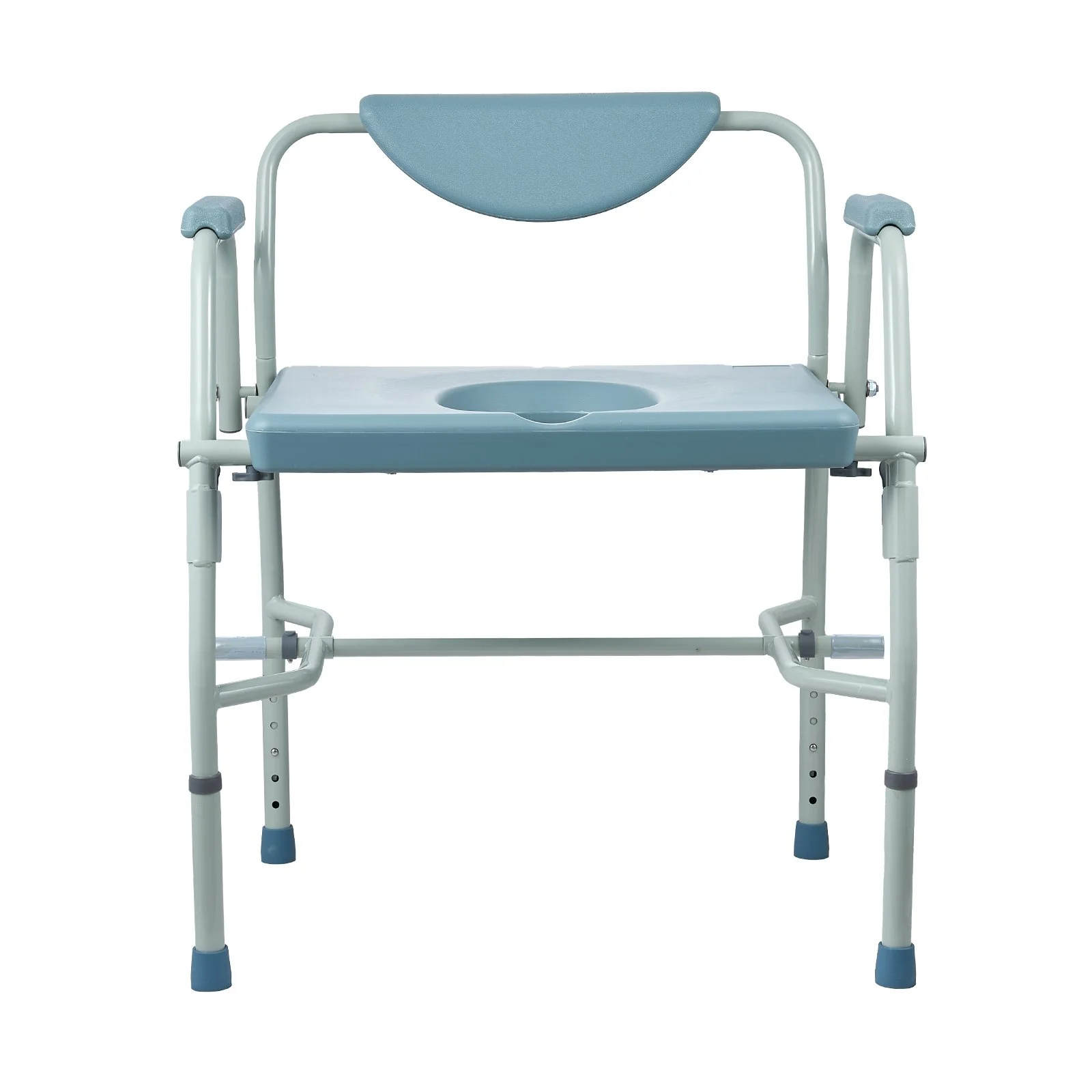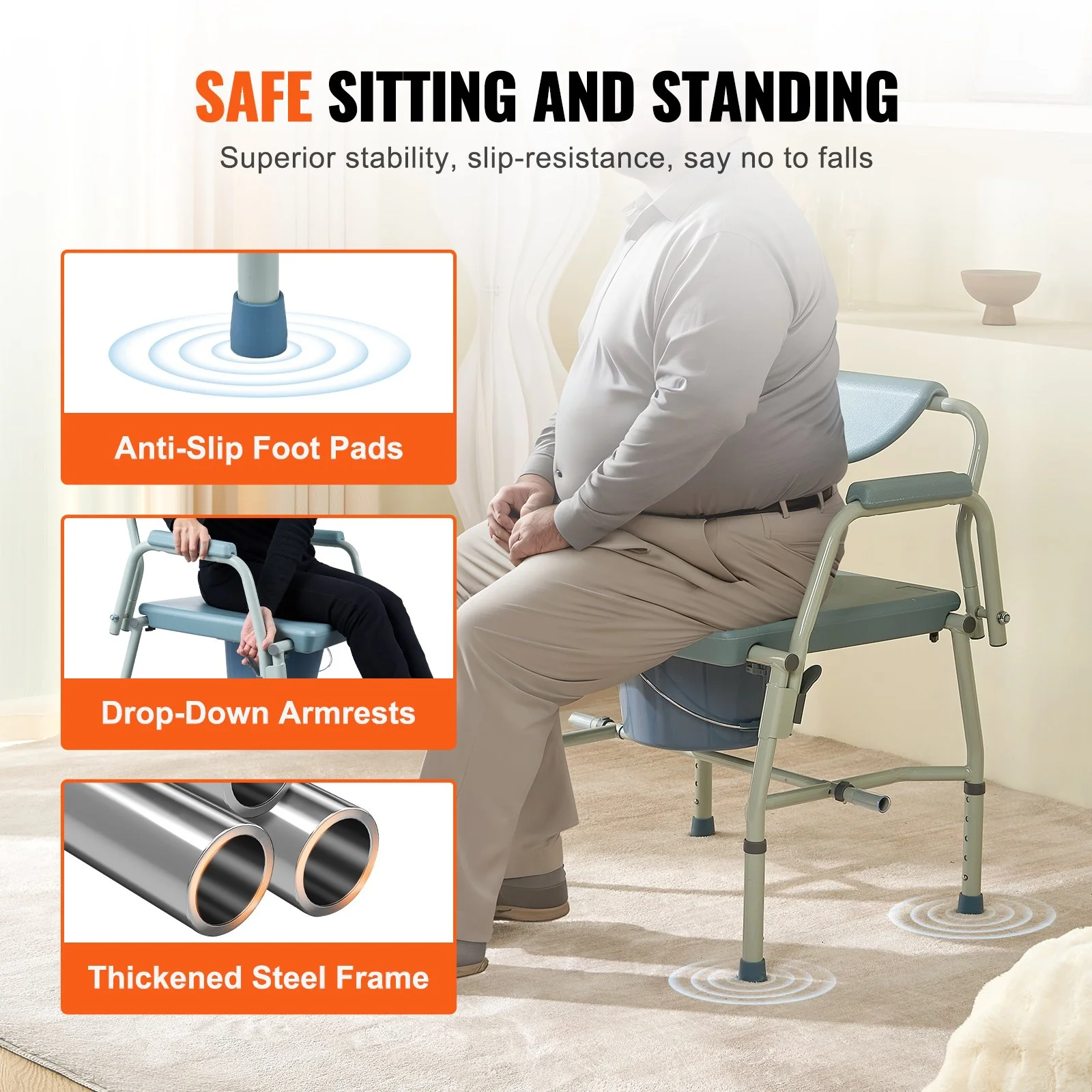 Our commode chair is constructed from 1.3mm thick steel, which is solid and reliable. The tool-free assembly is enhanced with simple twist knob screws, ensuring tightened stability that resists deformation and bending over time.