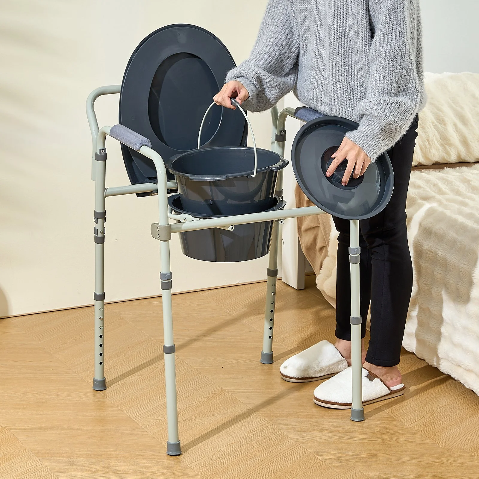 This bedside commode has a 3-in-1 bucket that can hold up to 5.8 liters. The bucket is made of easy-to-clean PE material and comes with a lid to control odor and maintain hygiene, making it perfect for bedroom use. Additionally, the bucket has a splash-guard design for added convenience, and it can be easily lifted out for cleaning.