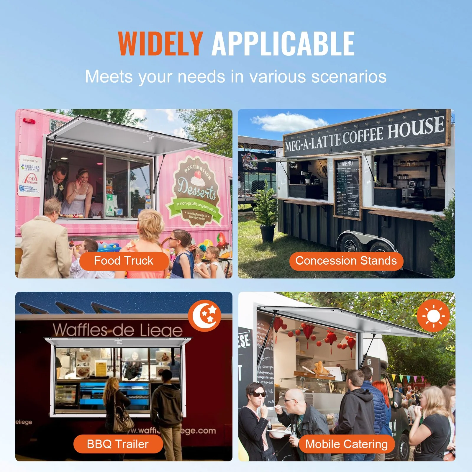 With an 85° wide opening angle for an expansive view, equipped with two hydraulic rods, serving window opens effortlessly. This concession window enables you to easily serve food to customers. The included sunshade protects against rain, sunlight, and theft.