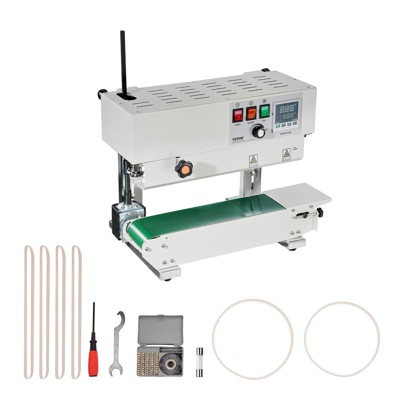 The band sealing machine includes toothed belts, Teflon belts, a fuse, and other accessories, ensuring backup and maintenance needs during prolonged use. This reduces maintenance costs and downtime risks, ensuring consistent production.