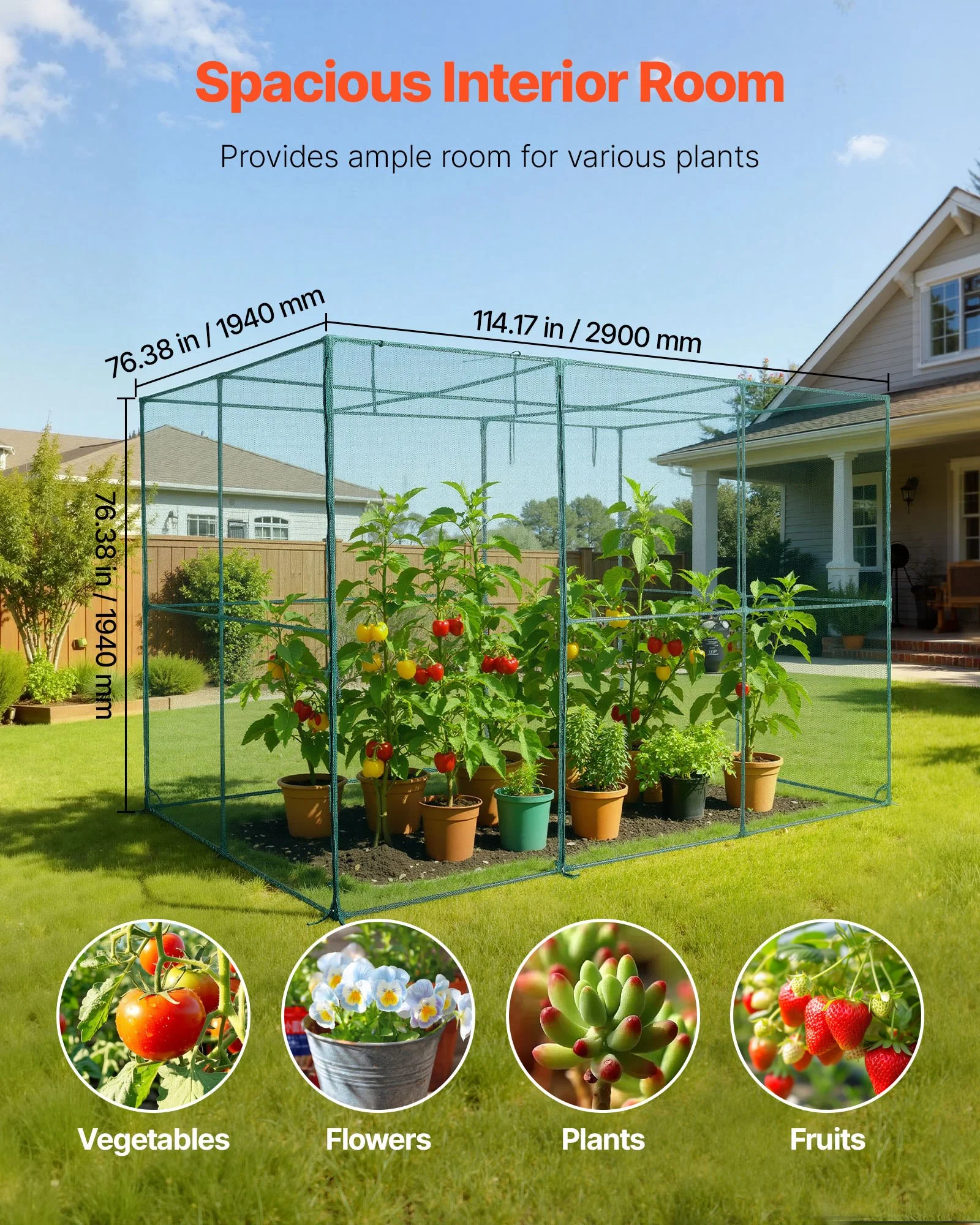 Measuring 114.17 x 76.38 x 76.38 in/2900 x 1940 x 1940 mm, this crop cages for garden provides ample space for vegetables, fruits, flowers, and other plants to thrive without external disturbance