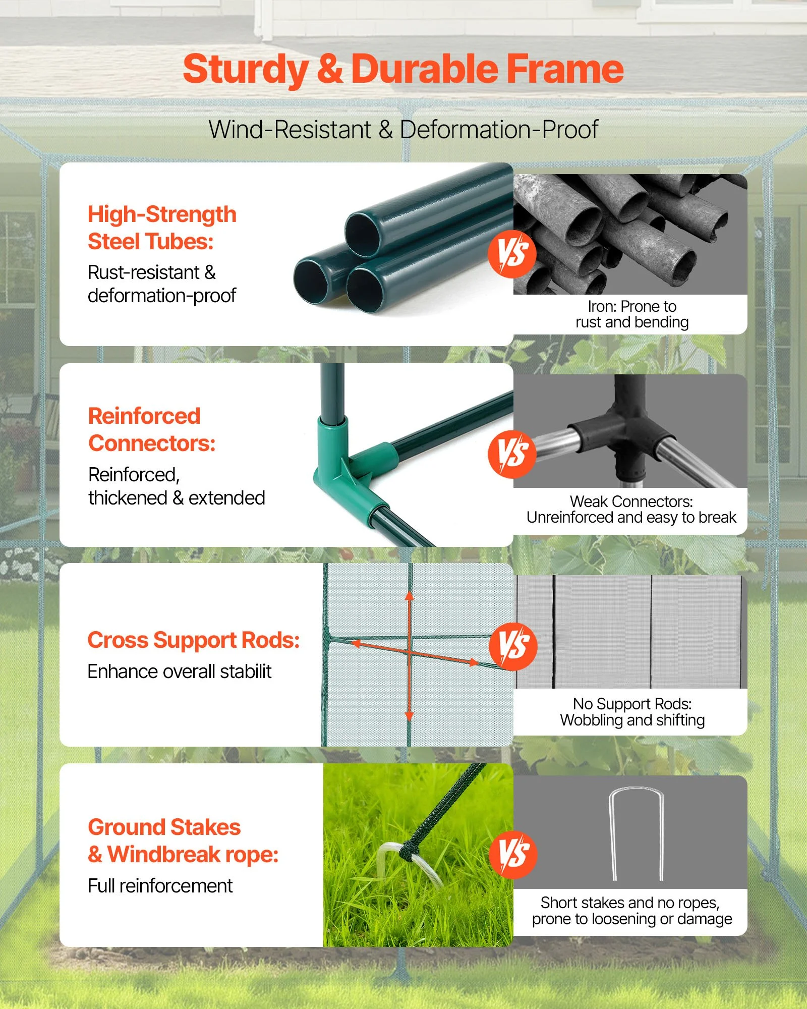 Made of powder-coated steel tubes, our plant protection tent is rust- and corrosion-resistant. Reinforced plastic joints and cross support rods add stability, while U-shaped ground stakes and guy ropes provide wind resistance