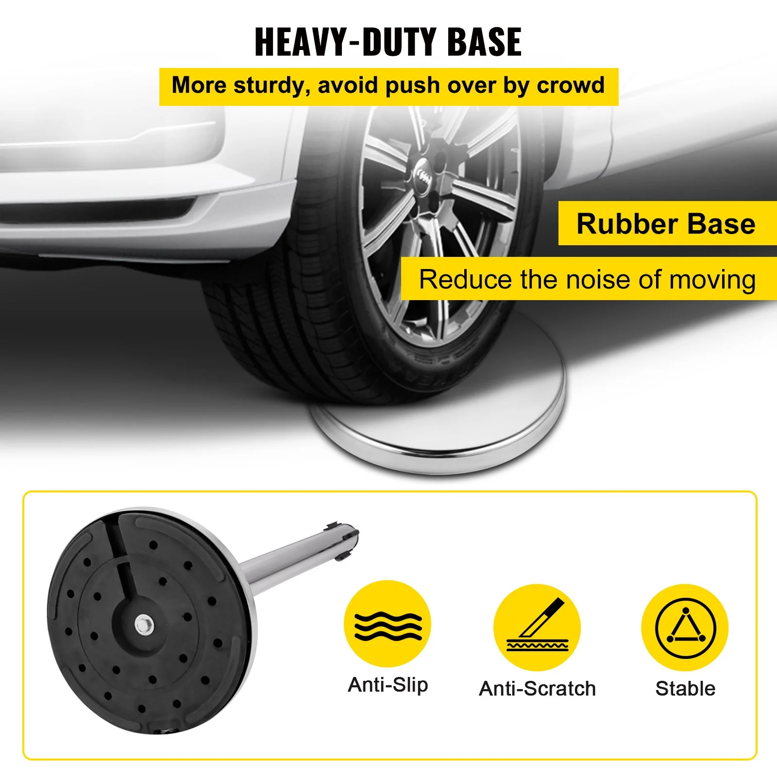 The base is constructed by rubber and filled with concrete to against heavy pressure and not damage your floor. The pedestal in our queue pole is strong enough and not easy to be pushed down by the crowd. In addition, the rubber can reduce the noise when moving or carrying.
