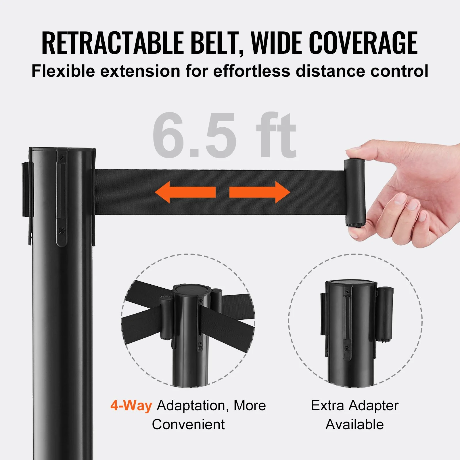 Our crowd control barriers come with 3PCS x 6.5ft retractable belts, offering effortless crowd management with adjustable length. The 4-way adapter enables isolation from four directions and combine poles conveniently, providing better flow control and space management.