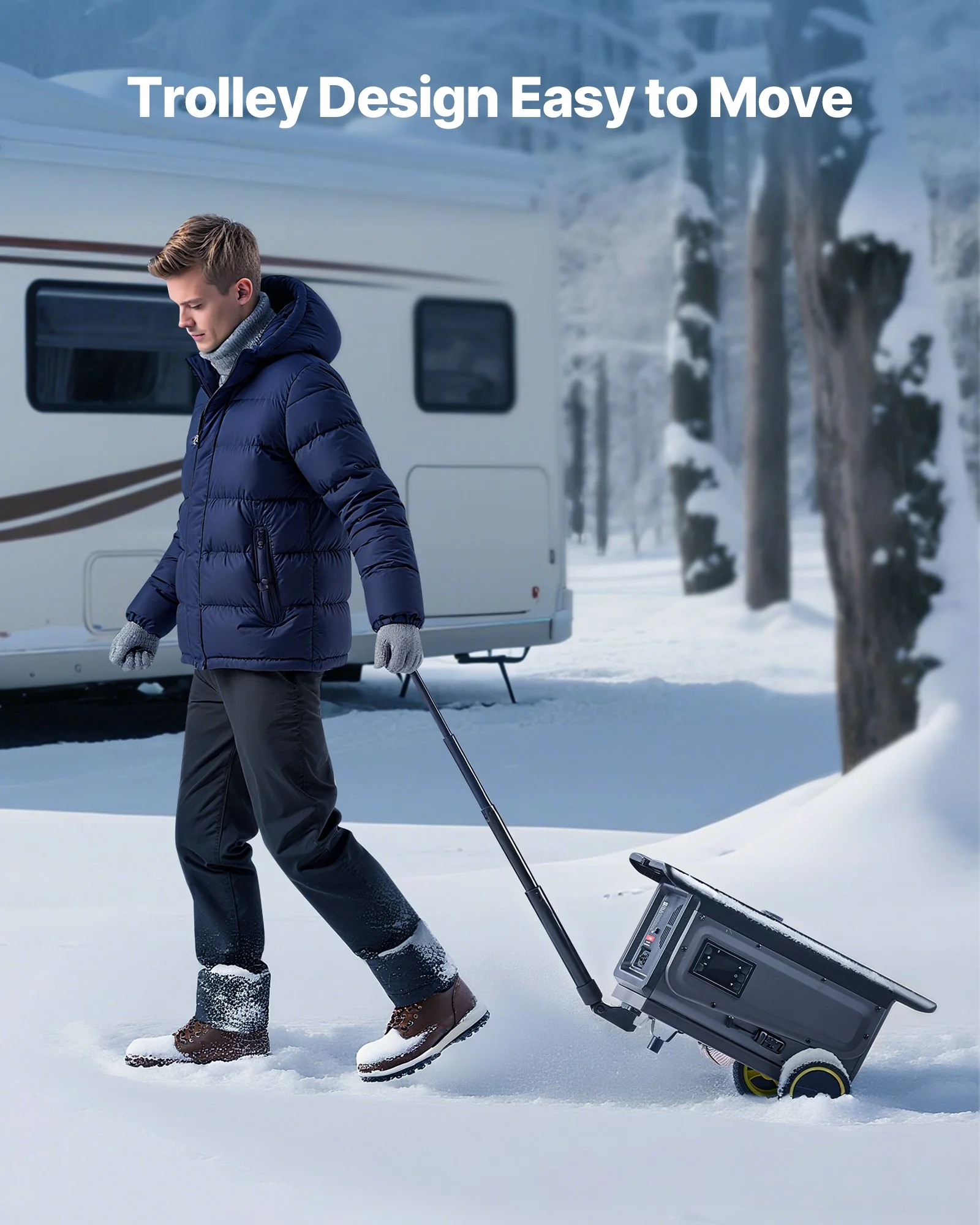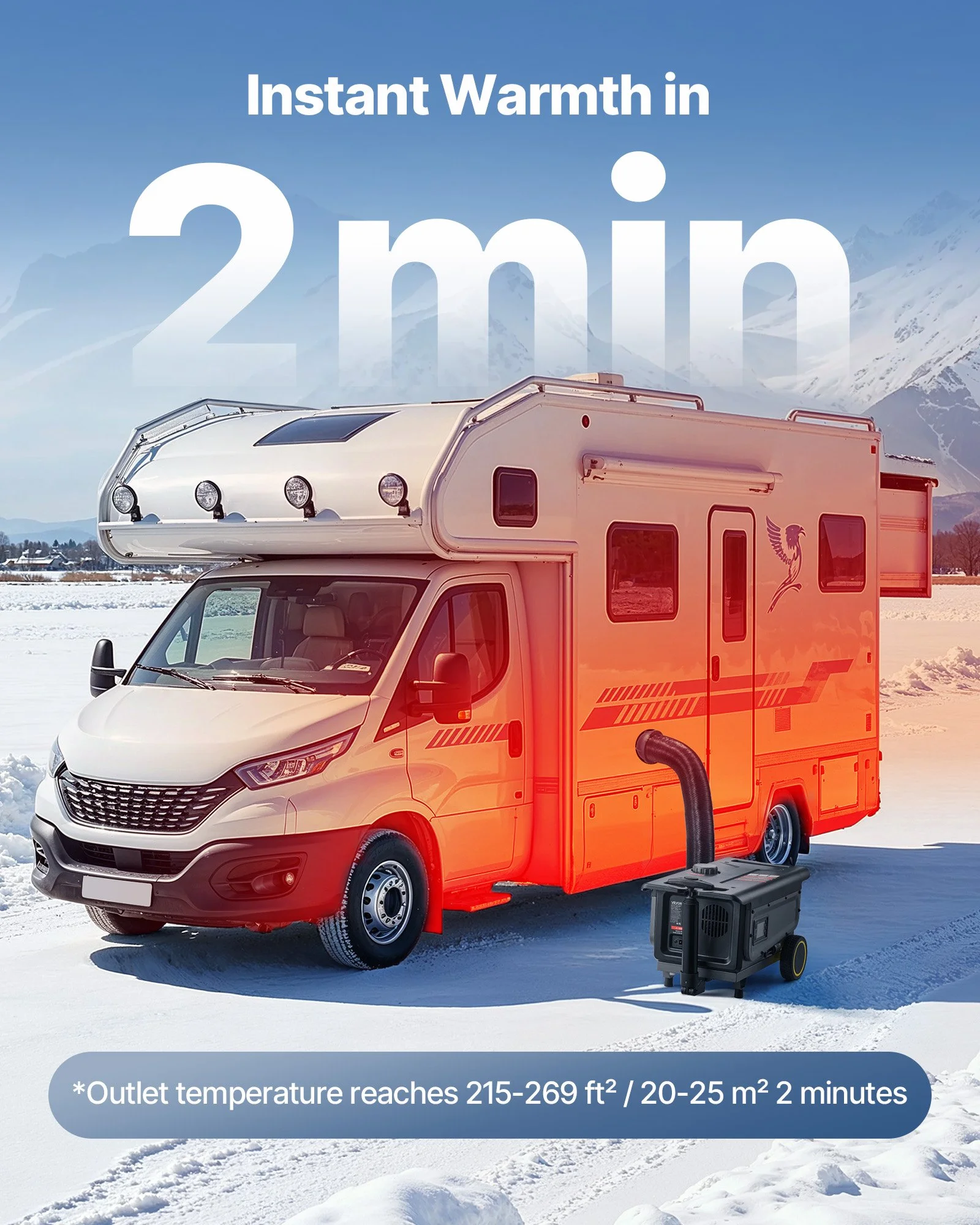 Our 8KW diesel heater heats spaces of 215-269 ft², reaching up to 210℉ in 5 minutes and creating a comfortable vehicle interior in 10 minutes. It works with 12V/24V power or a 220V outlet. The telescopic handle makes it easy to carry