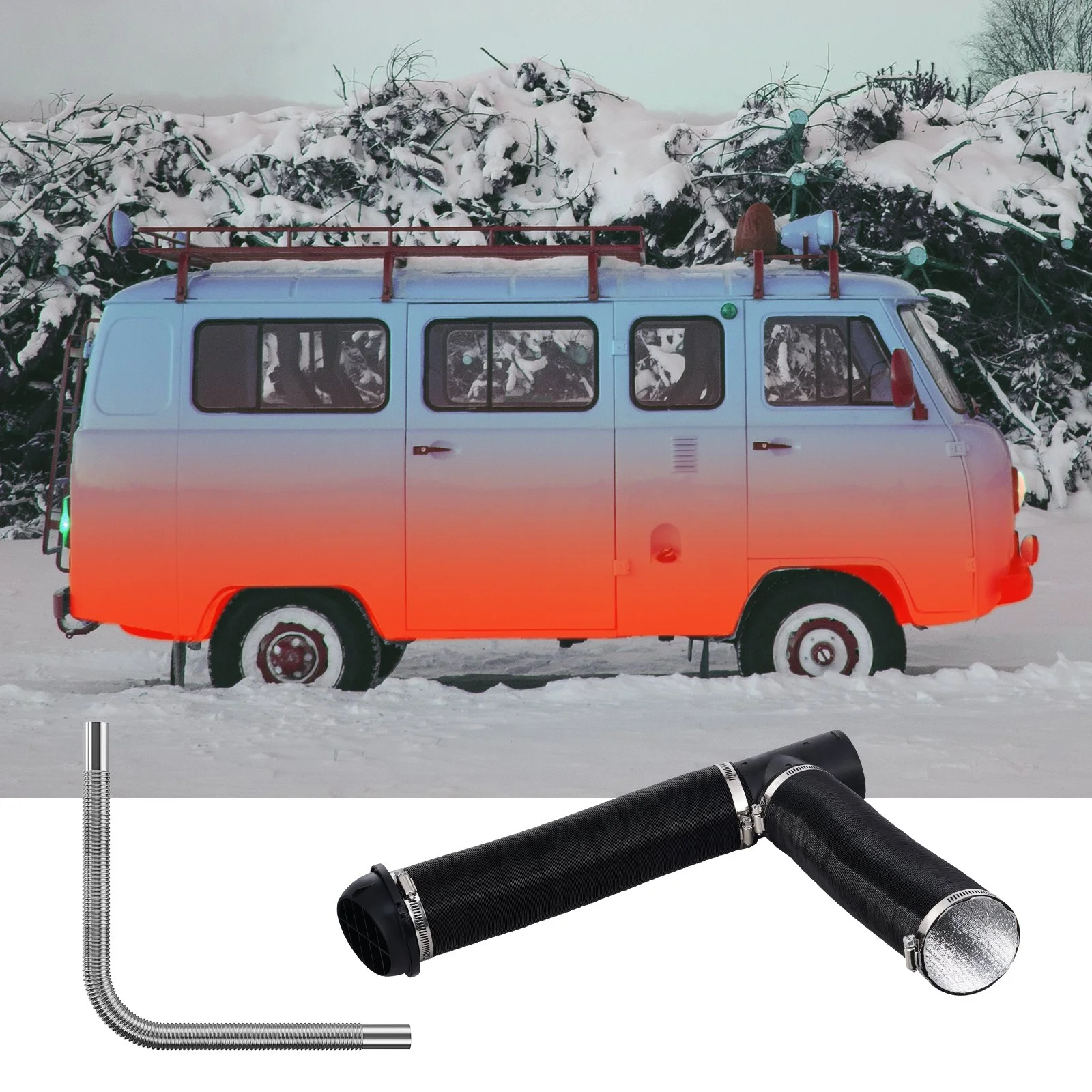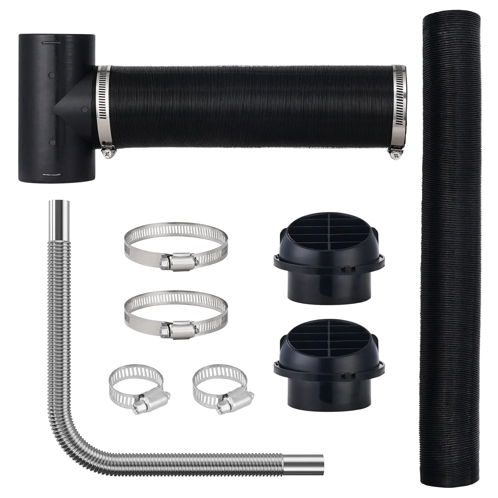 Suitable for 2KW/5KW/8KW diesel heaters, including split type and all-in-one type. The diesel heater hose duct kit includes 1 exhaust pipe, 2 outlet ducts, 4 outlet duct clamps, 2 exhaust pipe clamps, 2 air vent connectors, and 1 tee connector for comprehensive installation needs.