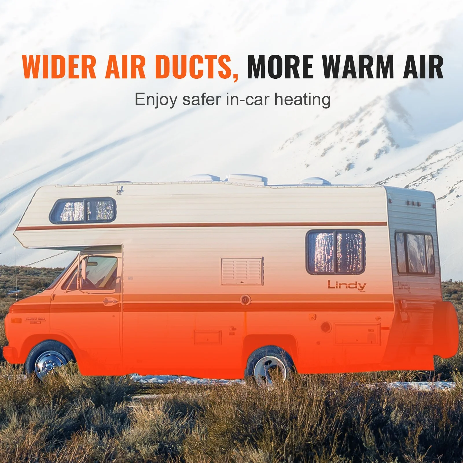 The outlet hose duct boasts a large 3-inch (76mm) diameter for rapid warm air delivery, while the exhaust pipe has a 1-inch (25mm) diameter for safe exhaust air discharge, enhancing interior heating safety.