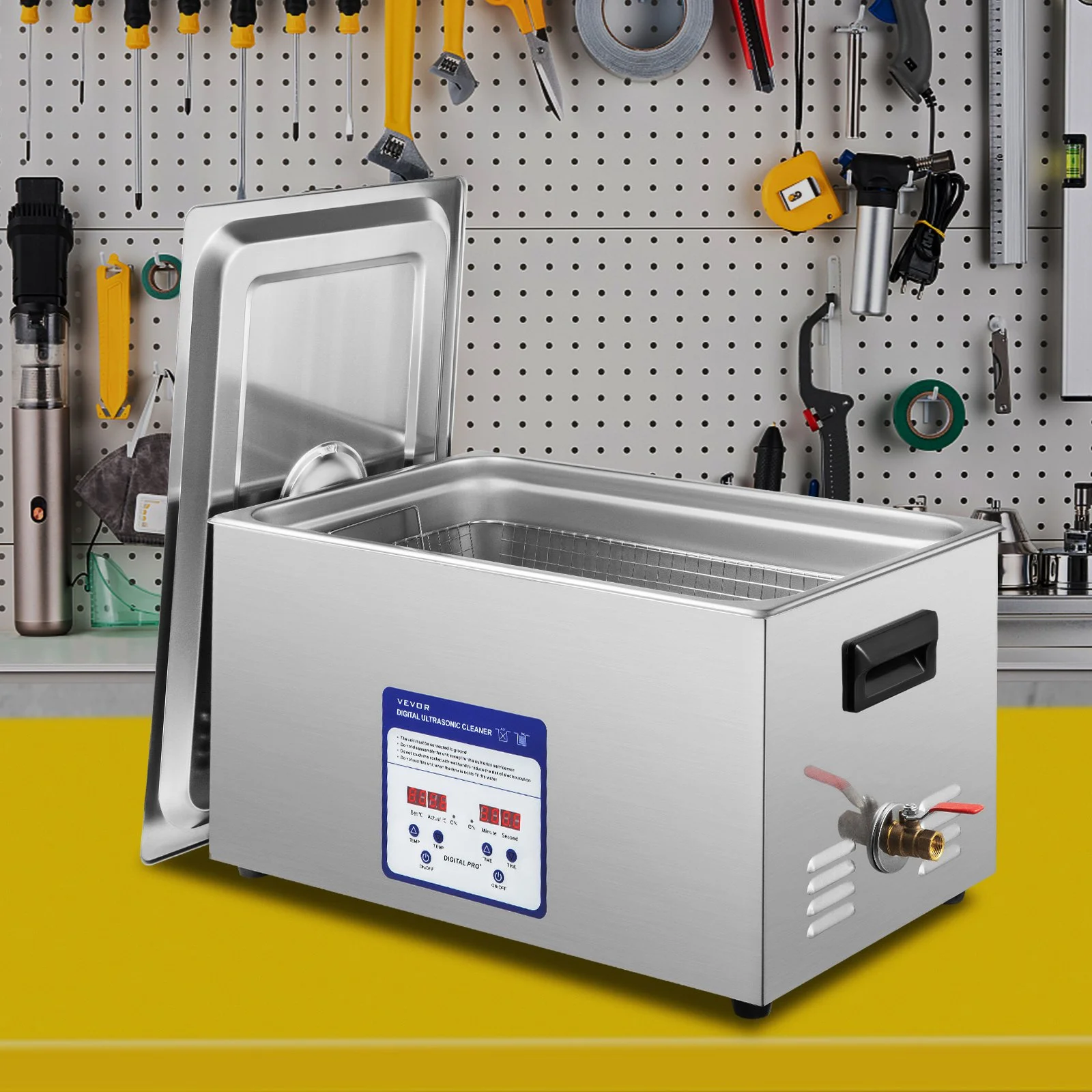 This commercial ultrasonic cleaner with a heater is designed for better customer use. Four non-skid rubber feet keep the machine stable during operation. The drainage system with a valve at the bottom is convenient to discharge residual water and keep the area clean.