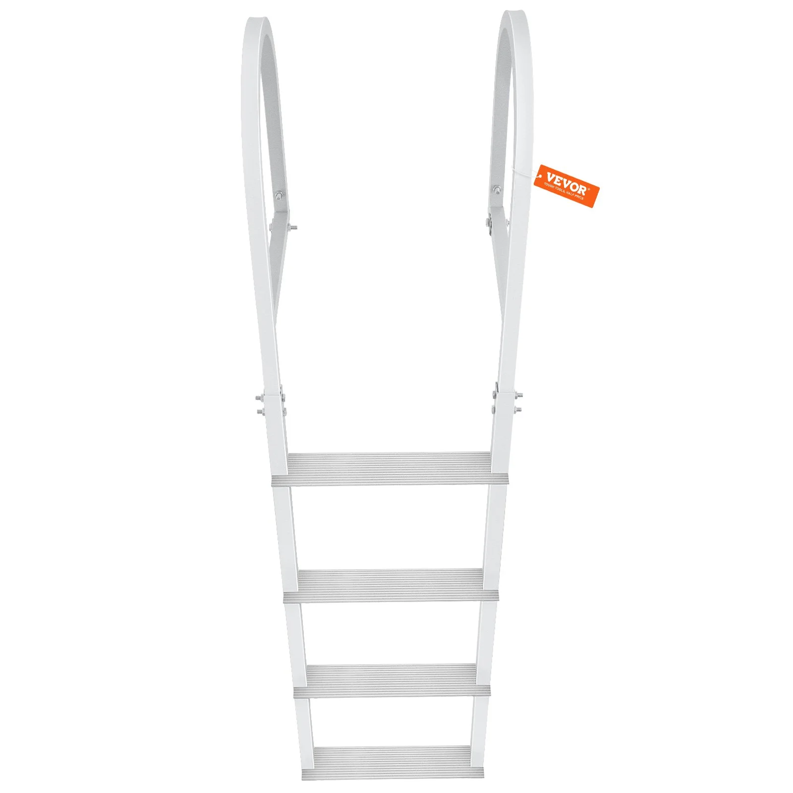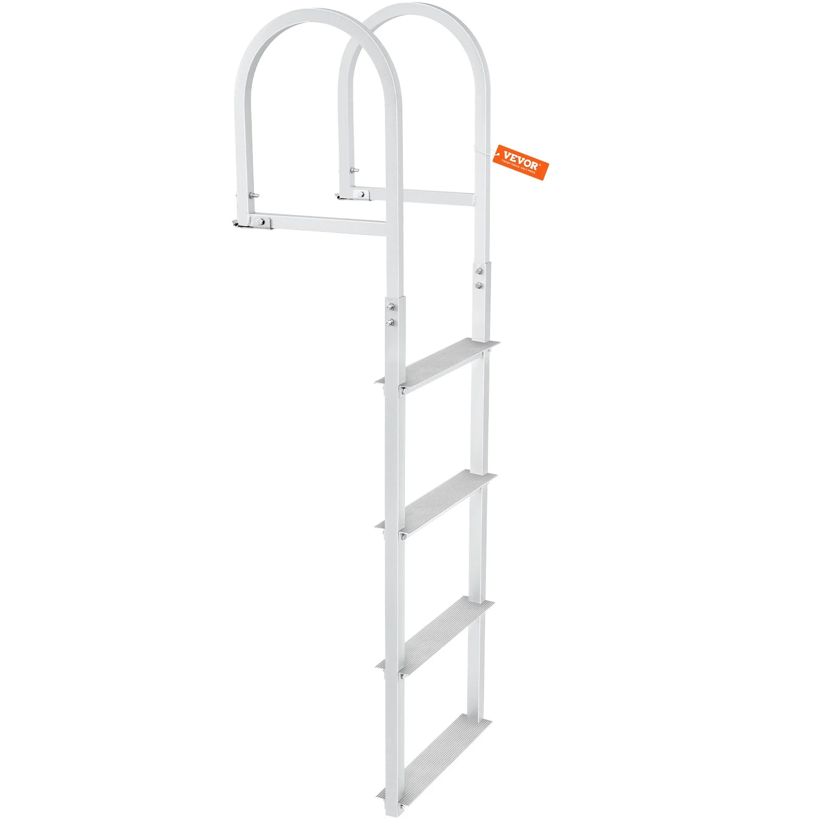 Our dock ladder features buckles design. Fix the snap ring bracket on the ground for the first time, and when the ladder is not in use, just pull the buckles out of the snap ring rack.