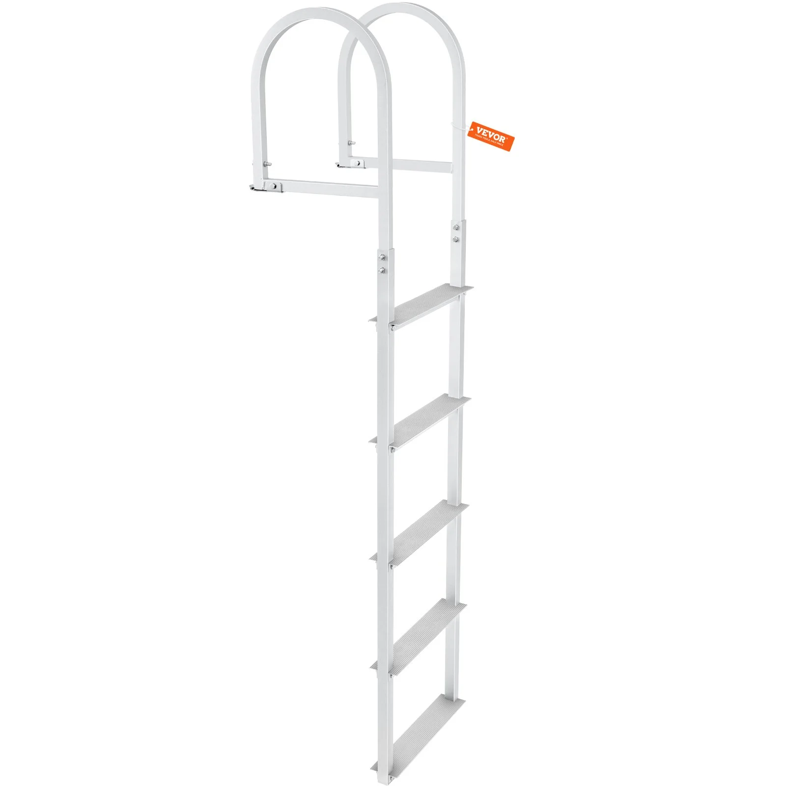 Our dock ladder features buckles design. Fix the snap ring bracket on the ground for the first time, and when the ladder is not in use, just pull the buckles out of the snap ring rack.
