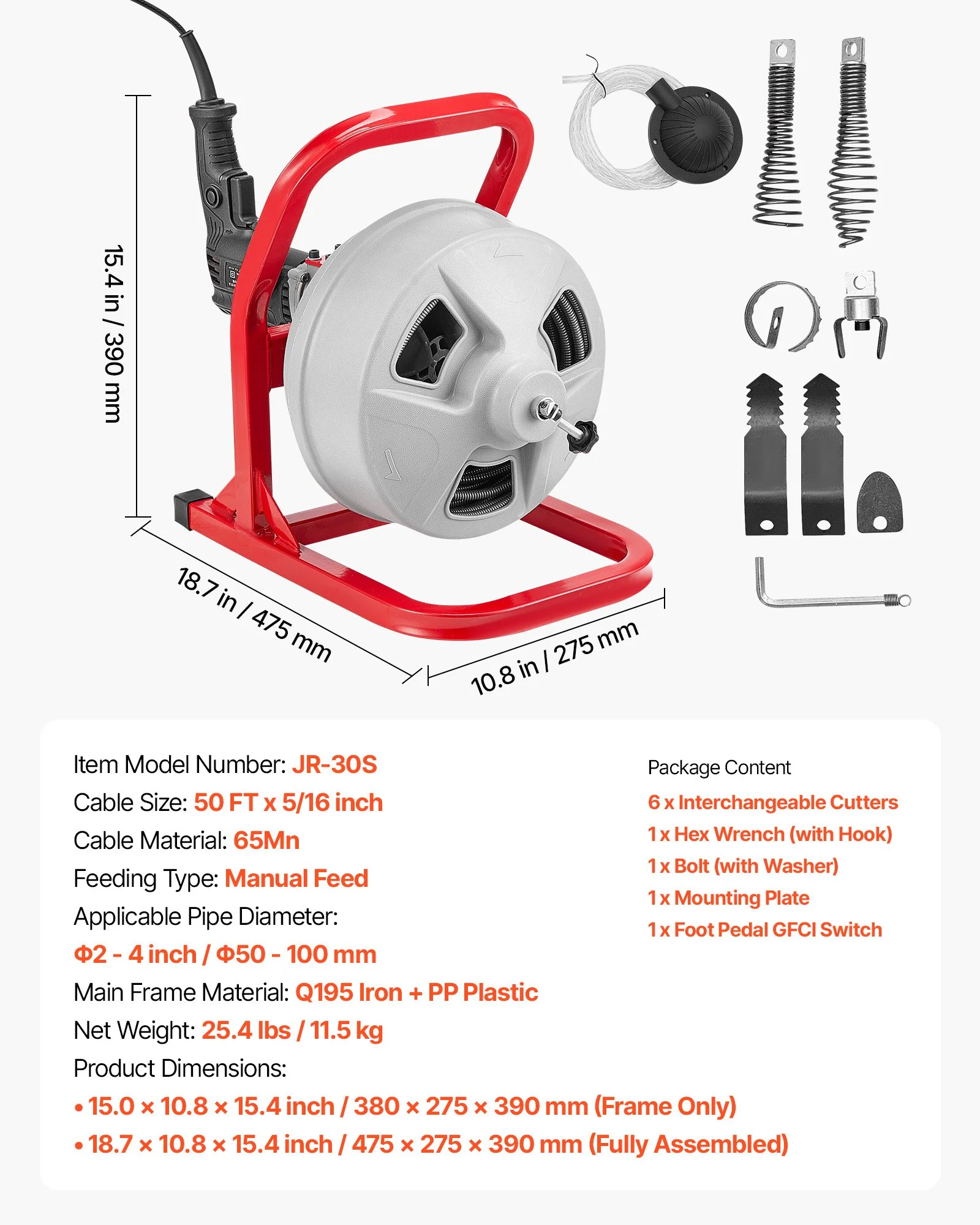 Our drain cleaning machine features a durable plastic drum that keeps the cable neatly organized. Lightweight body, ergonomic handle make it easy to carry and transport, and the included GFCI switch reduces electric shock risk