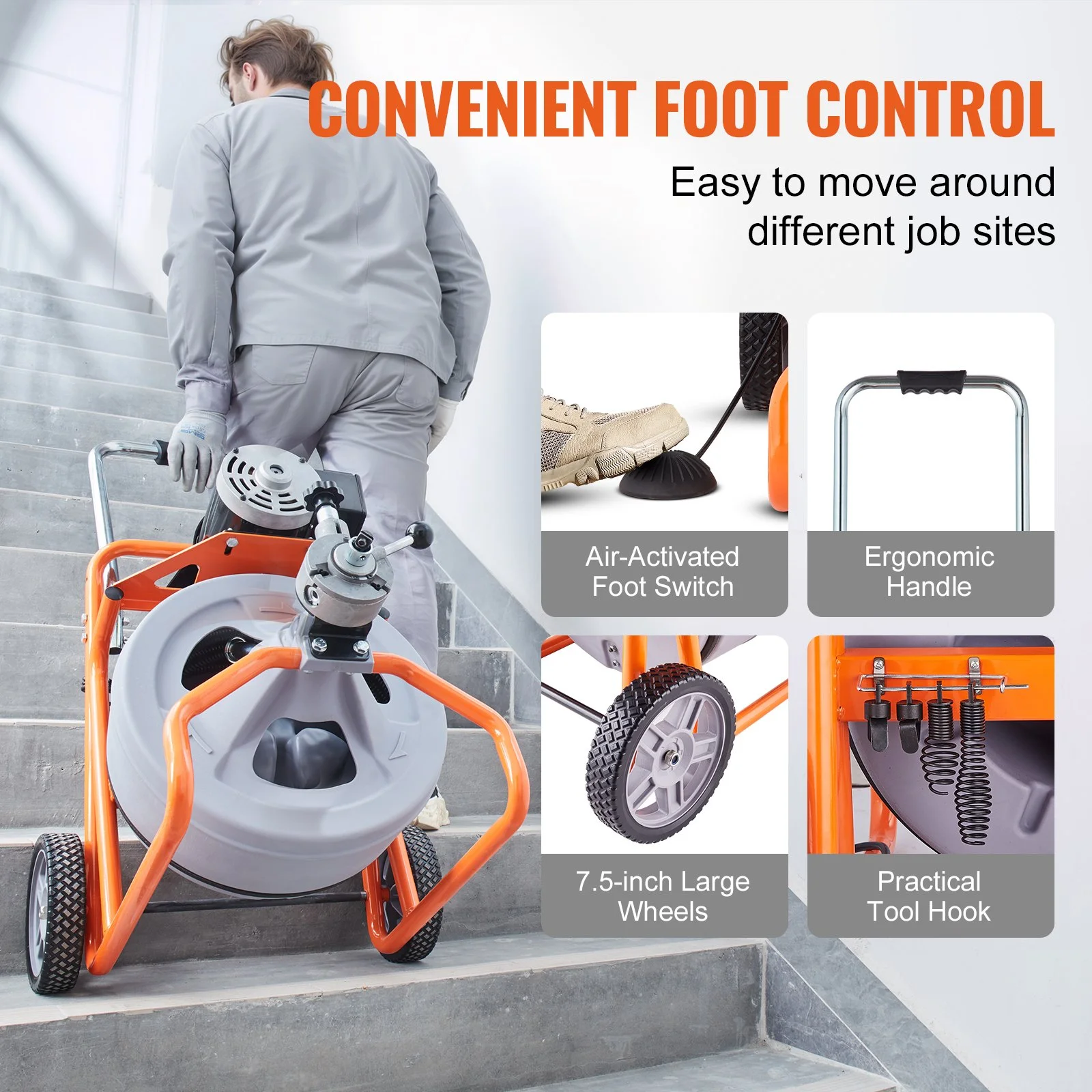 VEVOR drain cleaner machine features an automatic feed control system to power the cable in and out of drainage pipes. Enhanced with forward/reverse control and air-activated foot switch, managing the cable becomes more effortless