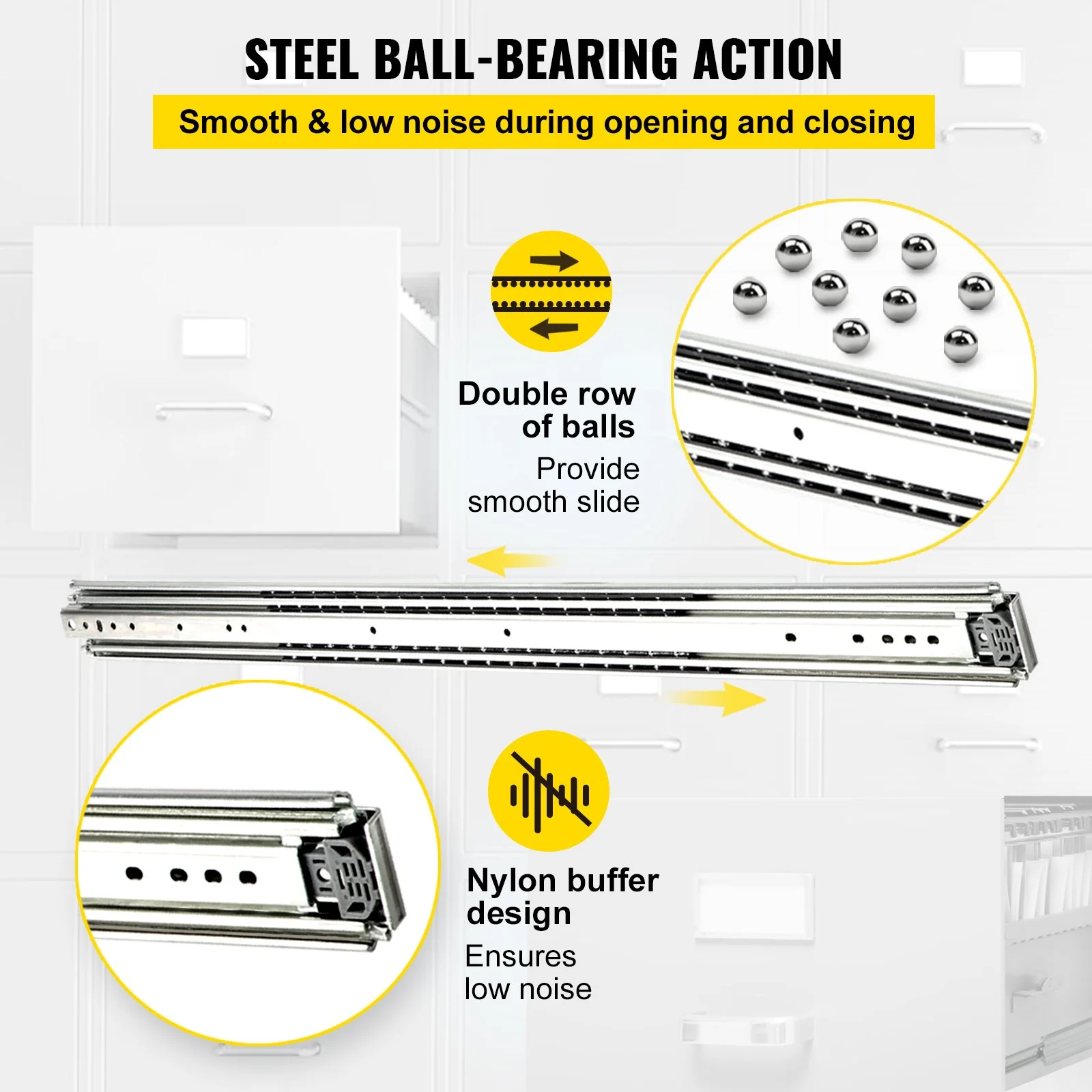 Drawer hardware slides are equipped with ball-bearing action to create a quiet environment for your family and work. The row of balls on the two sides of sliding and the nylon buffer design on the second section, which aim to make less noise and friction at closing and open the drawer.