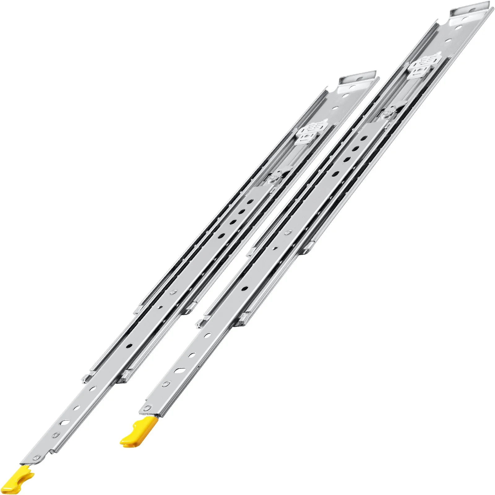 Constructed with 0.75"/ 19 mm thickness cold-rolled steel (CRS), the heavy-duty drawer slides have up to 500 lbs/ 227 kg load capacity. Secure and rugged enough to support heavy storage without deformation over time. The zinc-plated surface stays the extension drawer slide be rust-proof and abrasion-proof, ensuring lifetime use. The slides can be applied to goods shelves, cabinets, the industrial drawers, RVs, trucks, vending machines, etc.