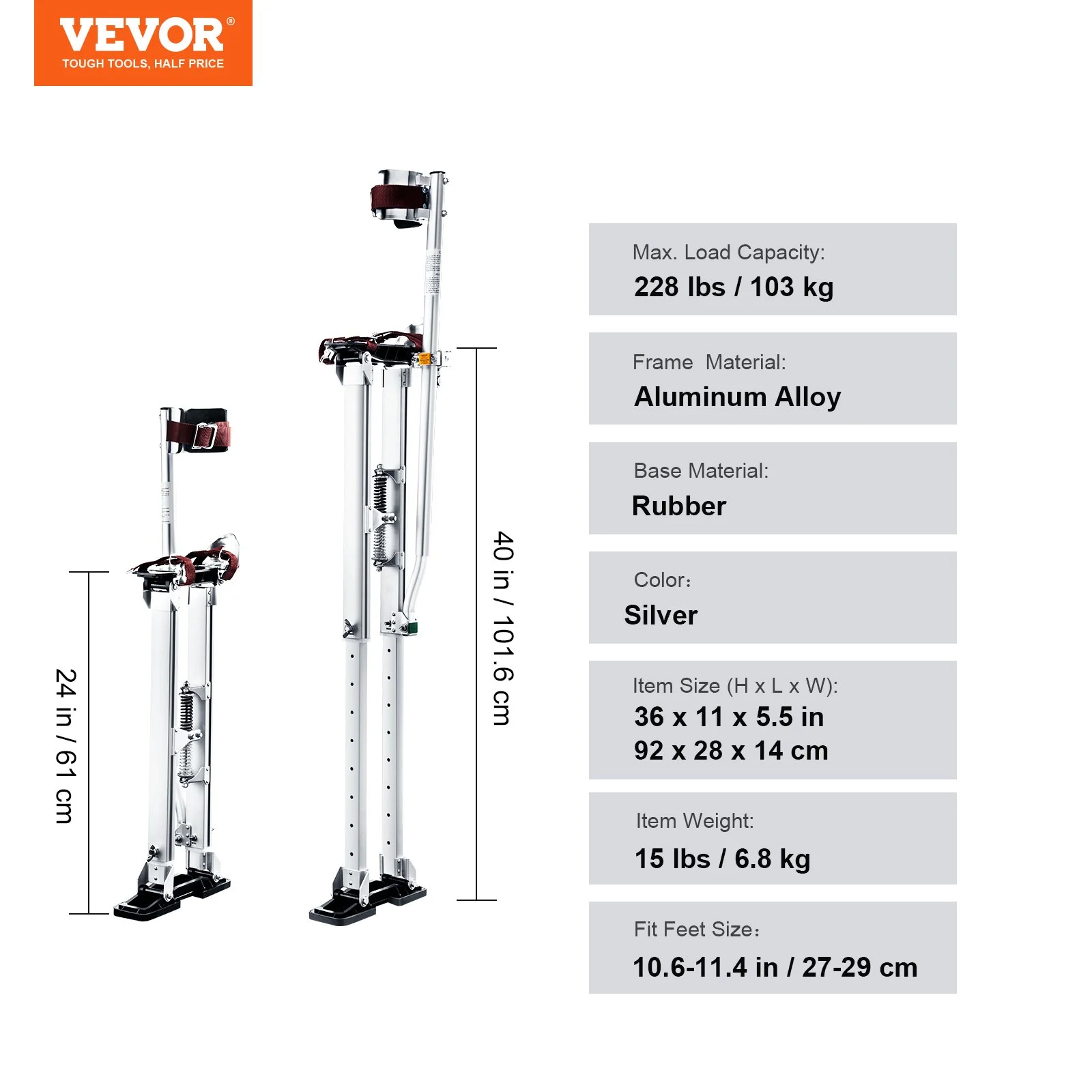 Get ready for more support! VEVOR's drywall stilts can easily hold up to 228 lbs. Made of robust aluminum alloy, featuring rust-proof, non-deformed, and optimal stability performance. Get ready to set the standard! In addition, you no longer have to worry about breakage due to its long service life.