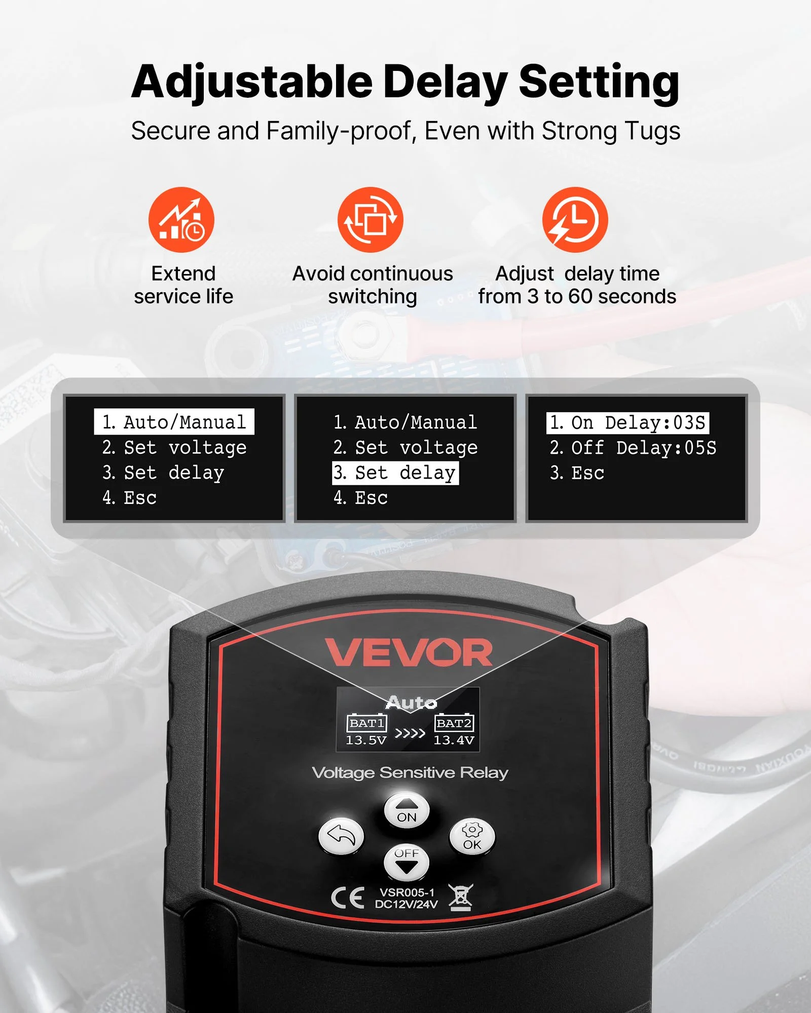With an adjustable delay time of 3-60 seconds, this VSR isolator effectively avoids frequent switching, significantly extending the service life of the isolator and battery