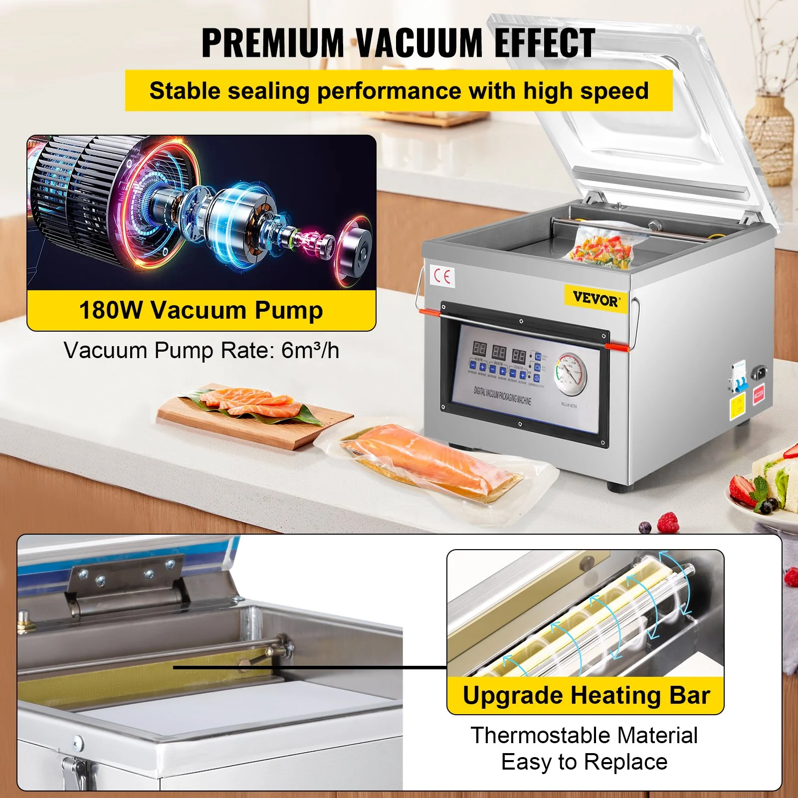 With a powerful motor boasting a max 1700W power and a max relative vacuum of -100KPa, our chamber vacuum sealer ensures a strong vacuum effect. Featuring a chamber size of 14 x 13.4 x 2.8 in/355 x 340 x 70 mm, 12.6 in/320 mm sealing length (bag), and 320W sealing power, it keeps your food fresh and flavorful. Plus, it operates quietly at less than 70 decibels.