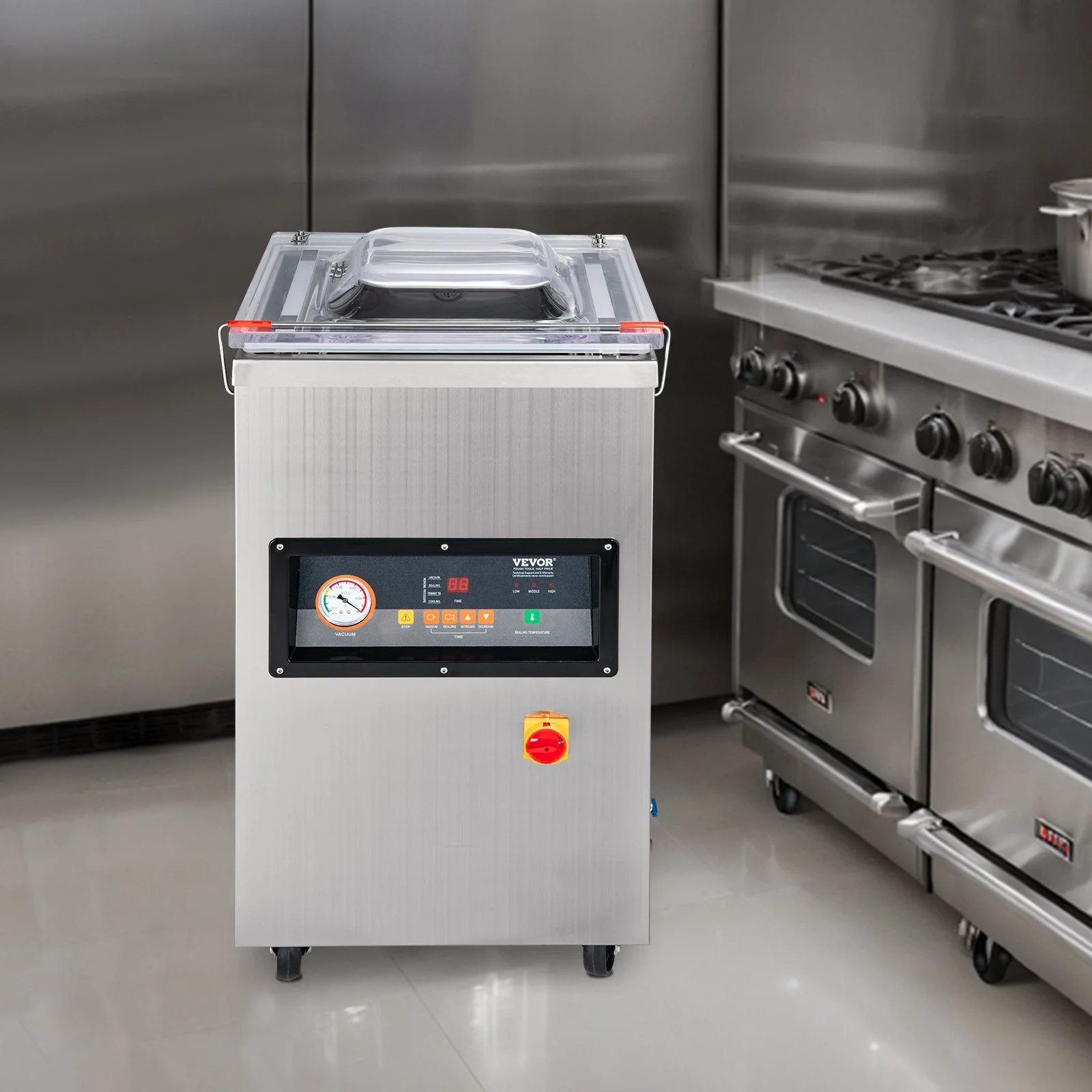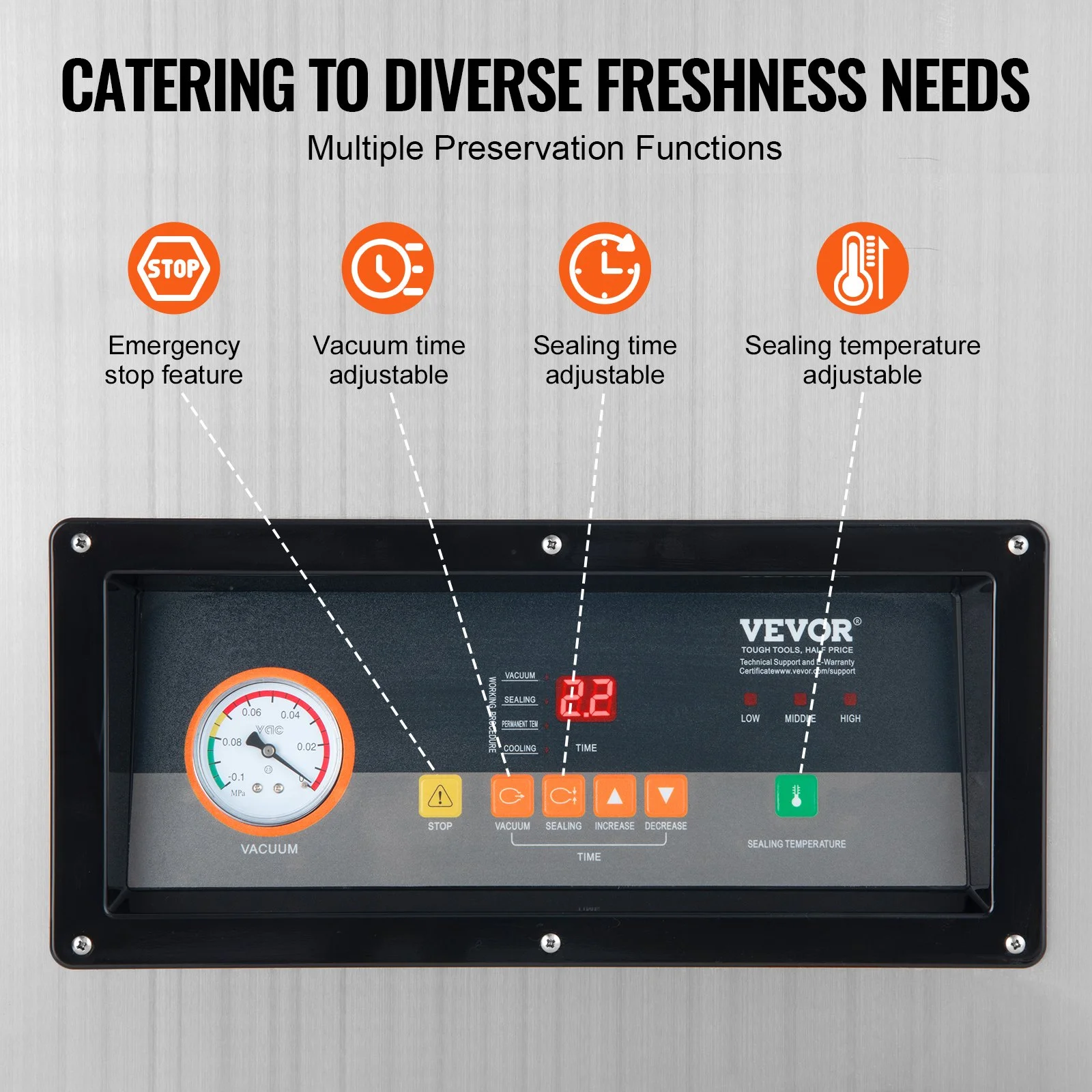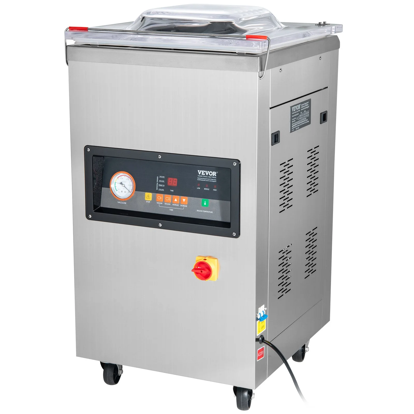 With a powerful motor boasting a max 3500W power and a max relative vacuum of -100KPa, our chamber vacuum sealer ensures a strong vacuum effect. Featuring a chamber size of 17.32 x 16.54 x 7.87 in/440 x 420 x 200 mm, 15.7 in/400 mm sealing length (bag), and 600W sealing power, it keeps your food fresh and flavorful. Plus, it operates quietly at less than 70 decibels.