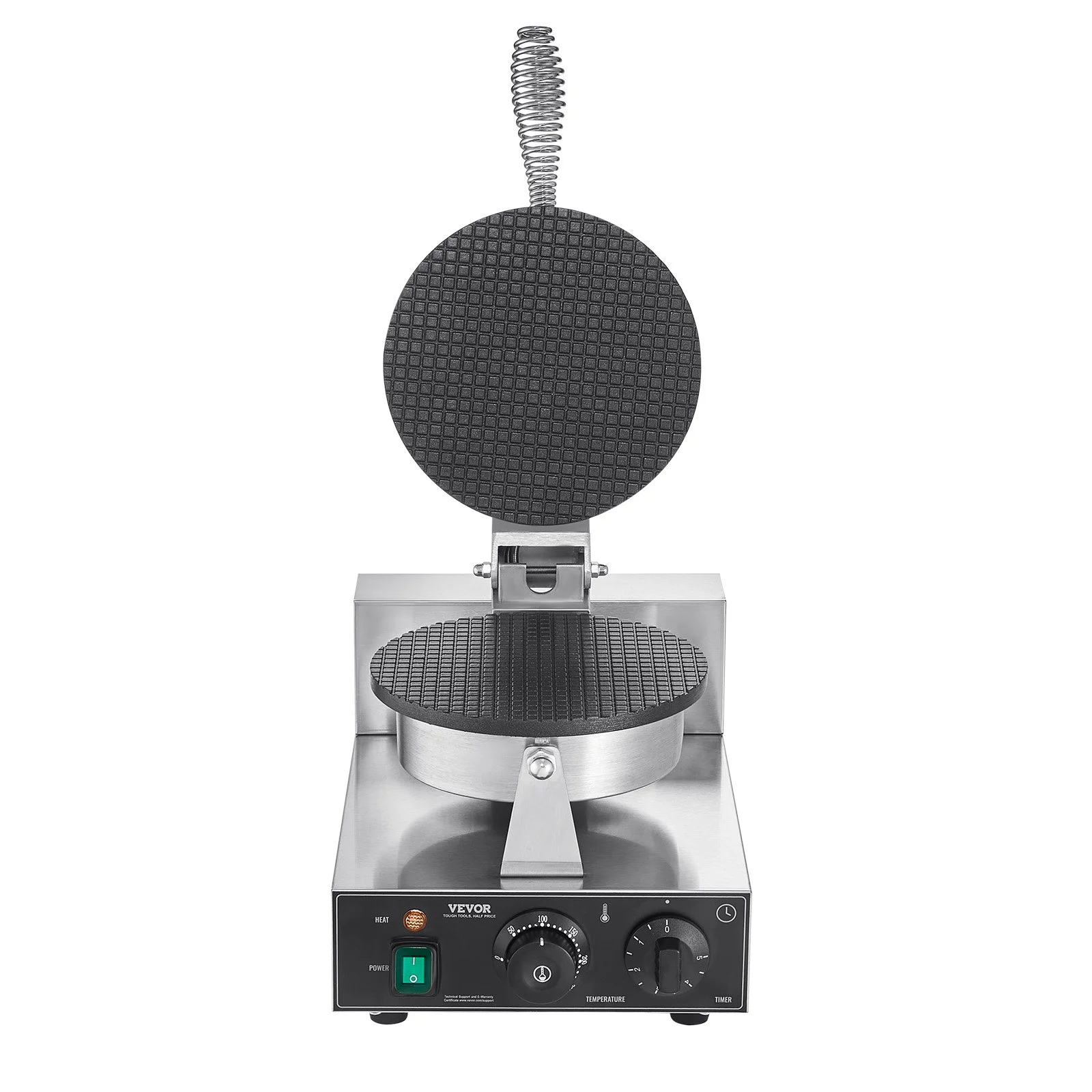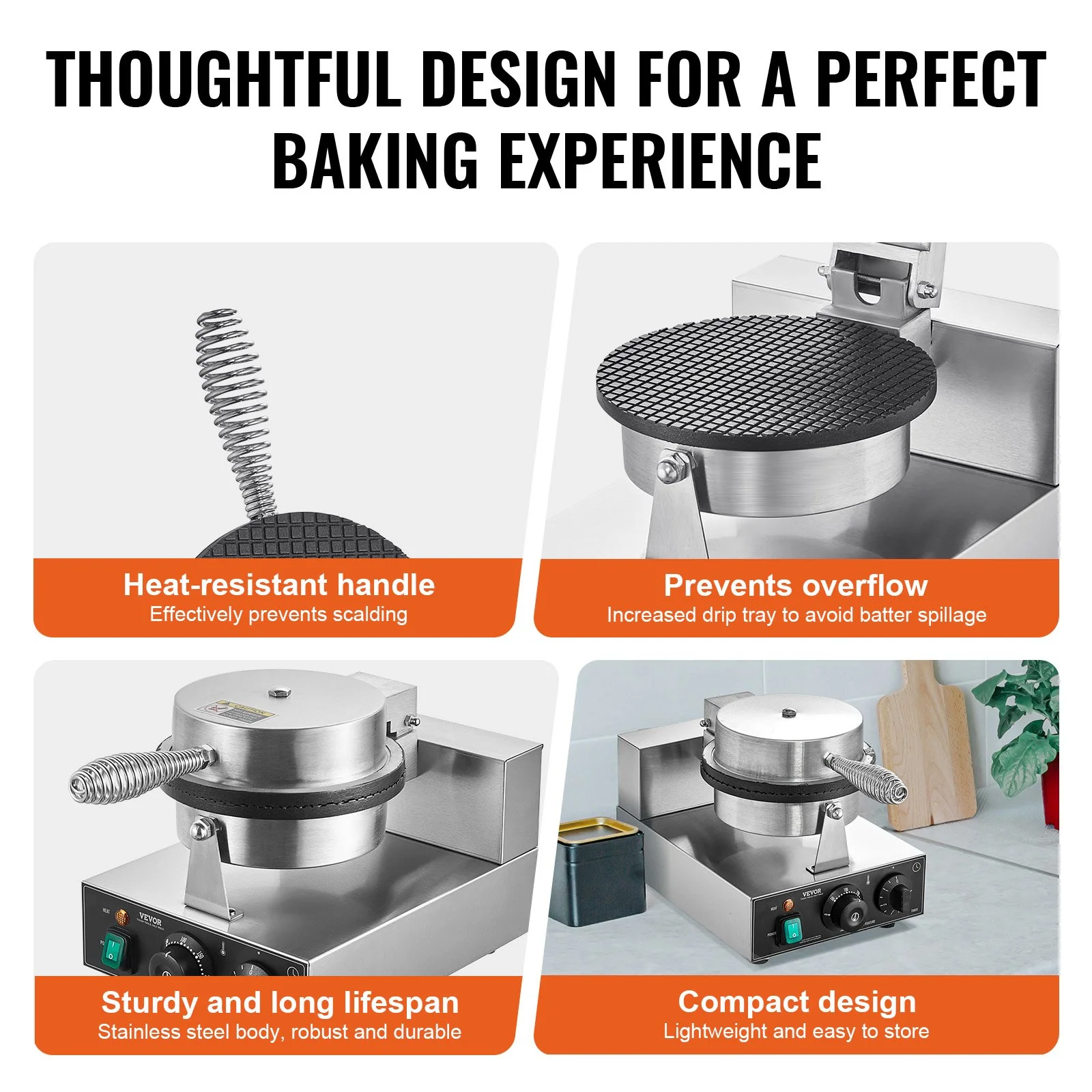 The spiral design with stainless steel handles helps prevent accidents such as slipping, overheating, and accidental burns. Four rubber feet at the base enhance the stability of our commercial waffle cone machine, keeping it steady during operation. The hinge connecting the two heating plates supports flexible closing and opening. Moreover, it comes equipped with a waffle cone shaping tool for quick cone formation.