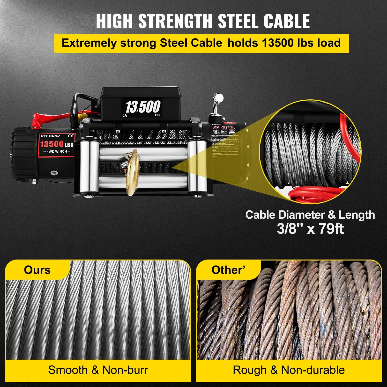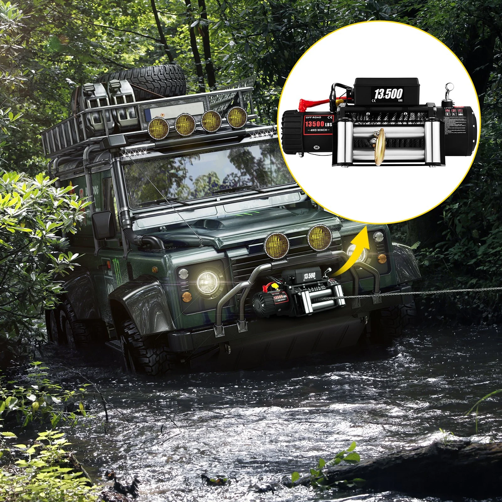 Electric Winch Load Capacity: 13,500 lbs (6123.5 kg); Power: 4.85 KW (6.8 HP); Gear Ratio: 265:1. The powerful motor is connected to a 3-stage planetary gear system for stronger pulling power and faster speed. Suitable for cars, boats, trucks, jeeps, modified vehicles, and multi-purpose utility trailers.