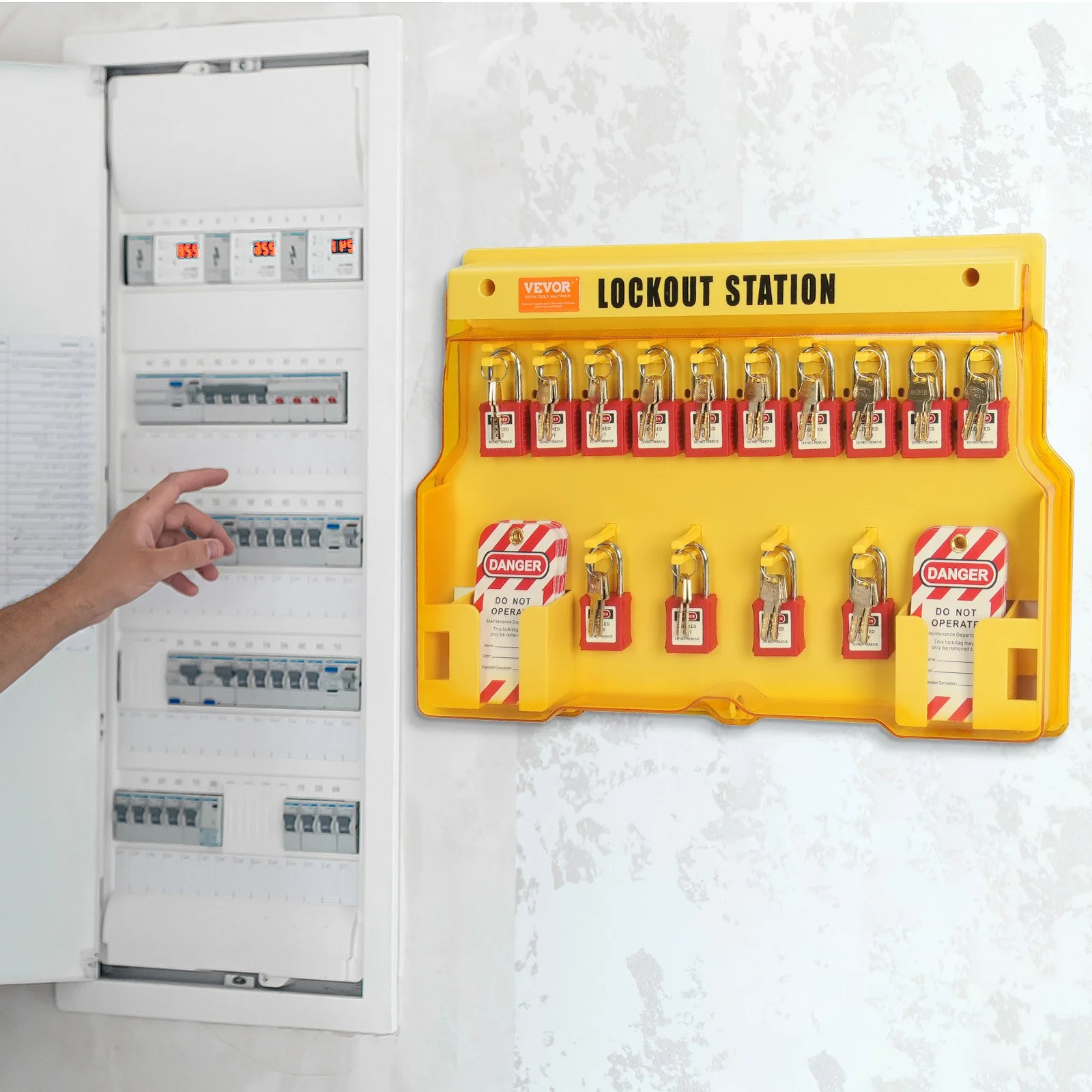 This electrical lockout tagout kit includes 14 safety padlocks, 3 hasps, 40 lockout tagouts, 40 nylon cable ties, 5 sets of plastic expansion kits, all conveniently stored in a hang board. Covering a variety of lockout needs for fixed panels and transformers, it serves as an integrated solution for most electrical safety tasks.