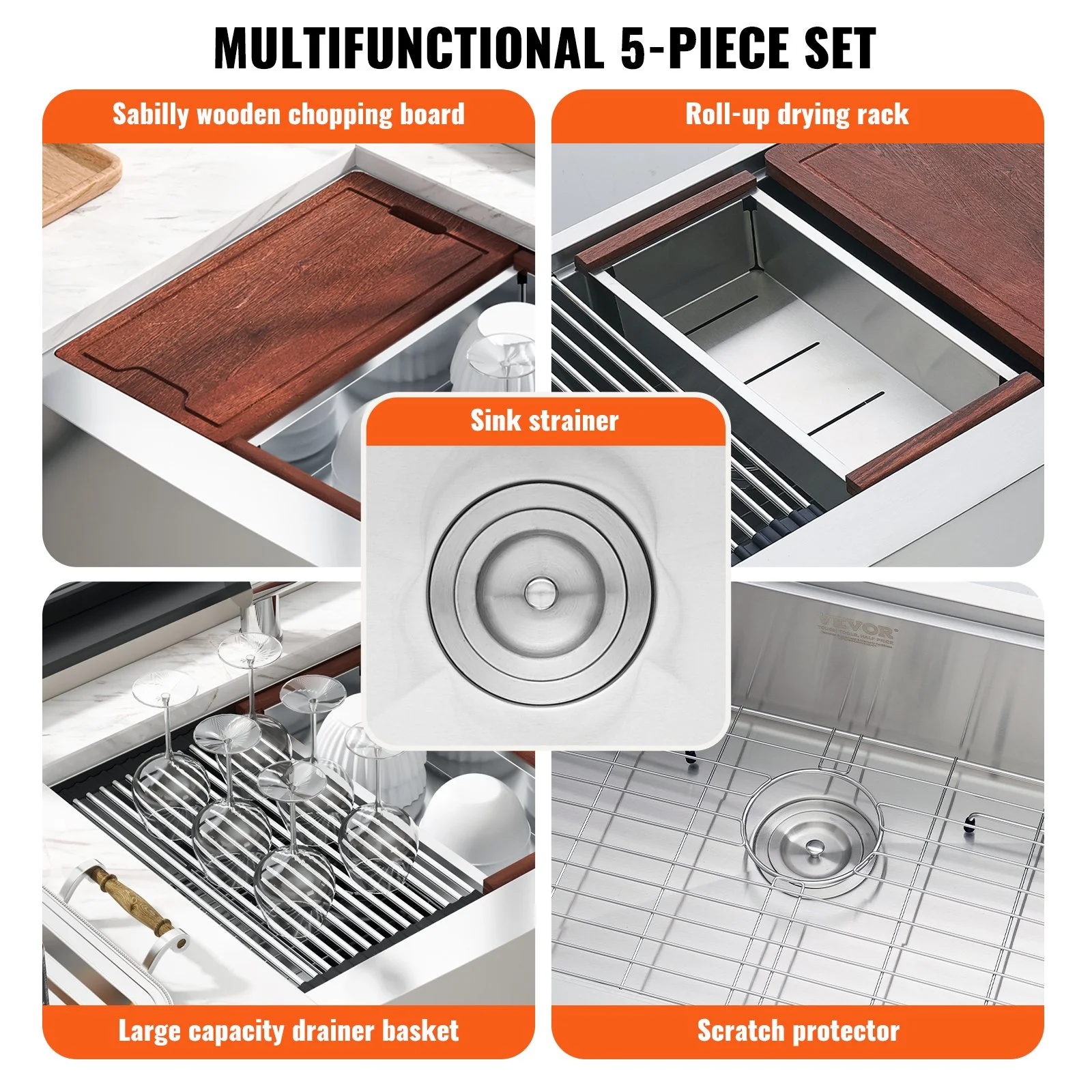 You will receive a premium Sahibili wood cutting board, stainless steel drain rack, and a draining basket among other accessories. You can assemble them to form a new kitchen workspace, allowing you to handle ingredients and dry utensils/fruits and vegetables over the drop-in sink, saving countertop space.