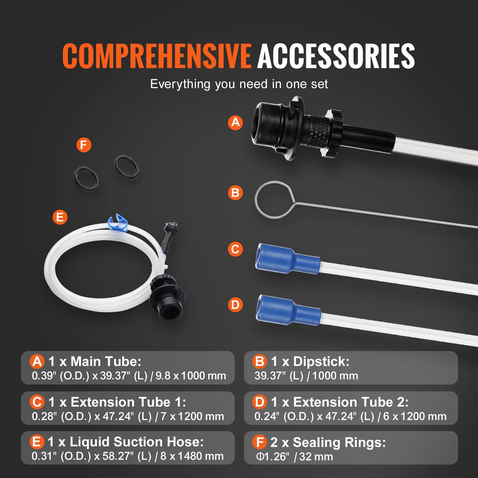 With four sizes of suck-it-all-up oil extractor tubes, you're reaching the deepest depths, leaving tanks dry. Main Tube: 9.8" x 39.37" / 249 x 1000 mm; Extension Tube 1: 0.28" x 47.24" / 7 x 1200 mm; Extension Tube 2: 0.24" x 47.24" / 6 x 1200 mm; Suction Hose: 0.31" x 58.27" / 8 x 1480 mm.