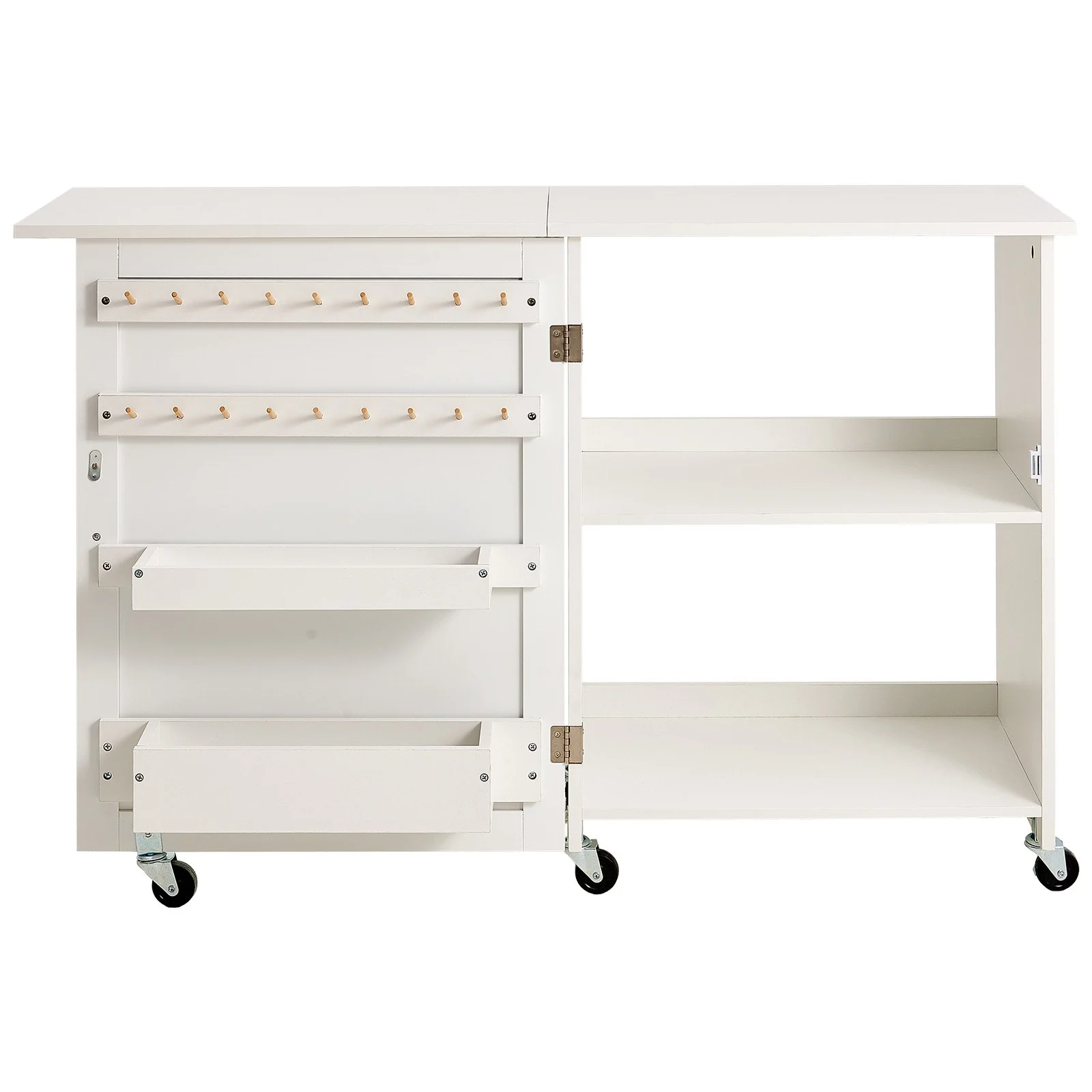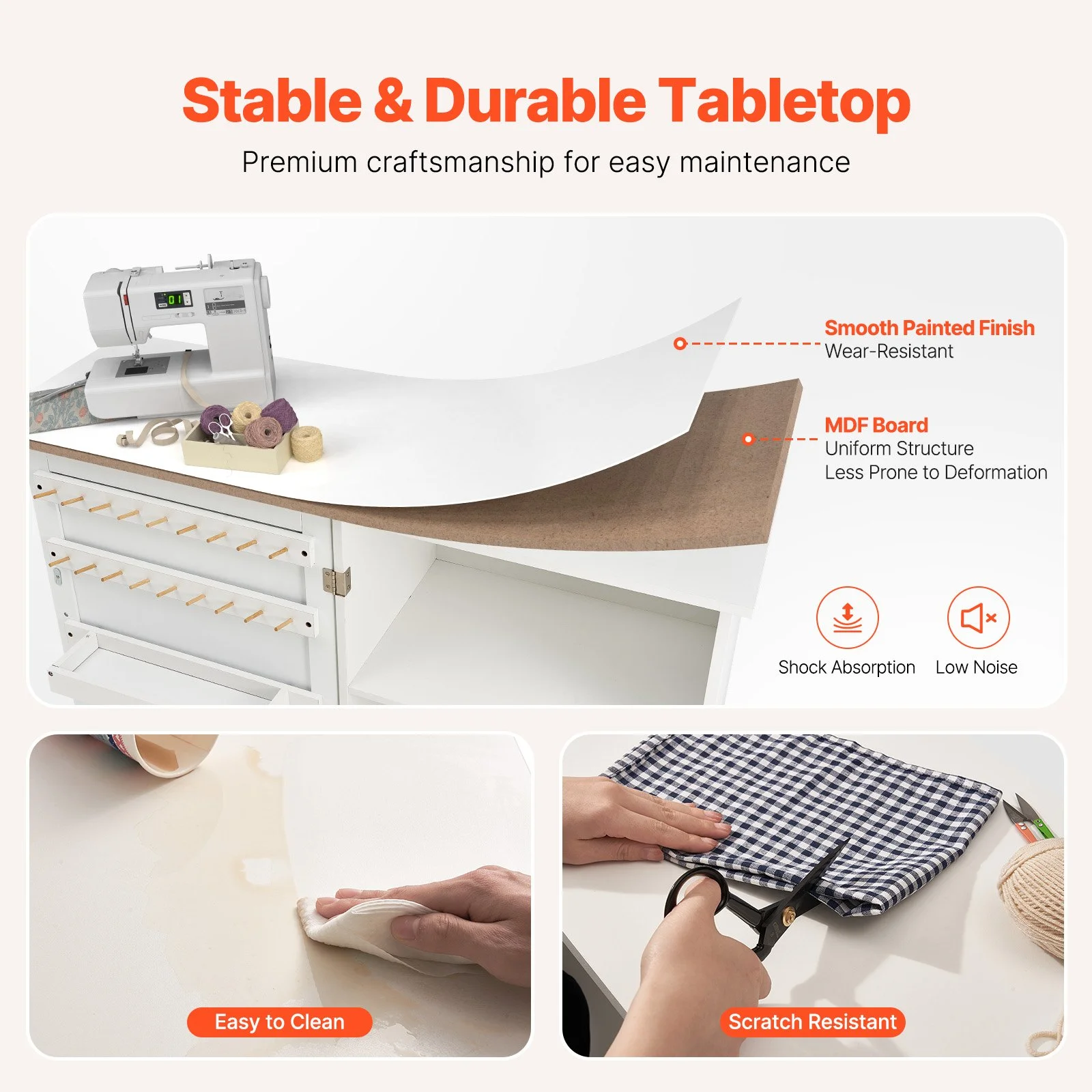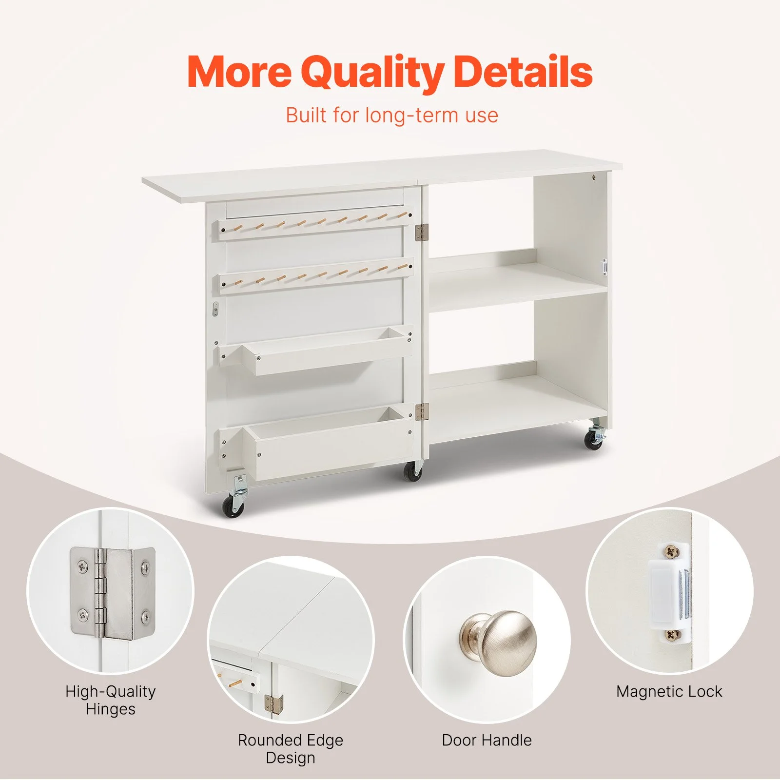 Our sewing table with storage features premium door hinges for smooth opening and closing, and elegant door handles for easy access. The cabinet doors include magnetic locks to prevent items from falling out, ensuring your materials stay secure.