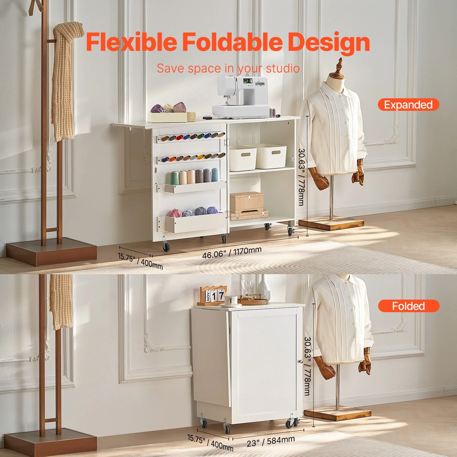 Our sewing machine table is designed for easy folding and unfolding. Fold it into a compact side cabinet when not in use, or open it up to create a spacious sewing station. It can also serve as a work desk or display cabinet in your study or living room.