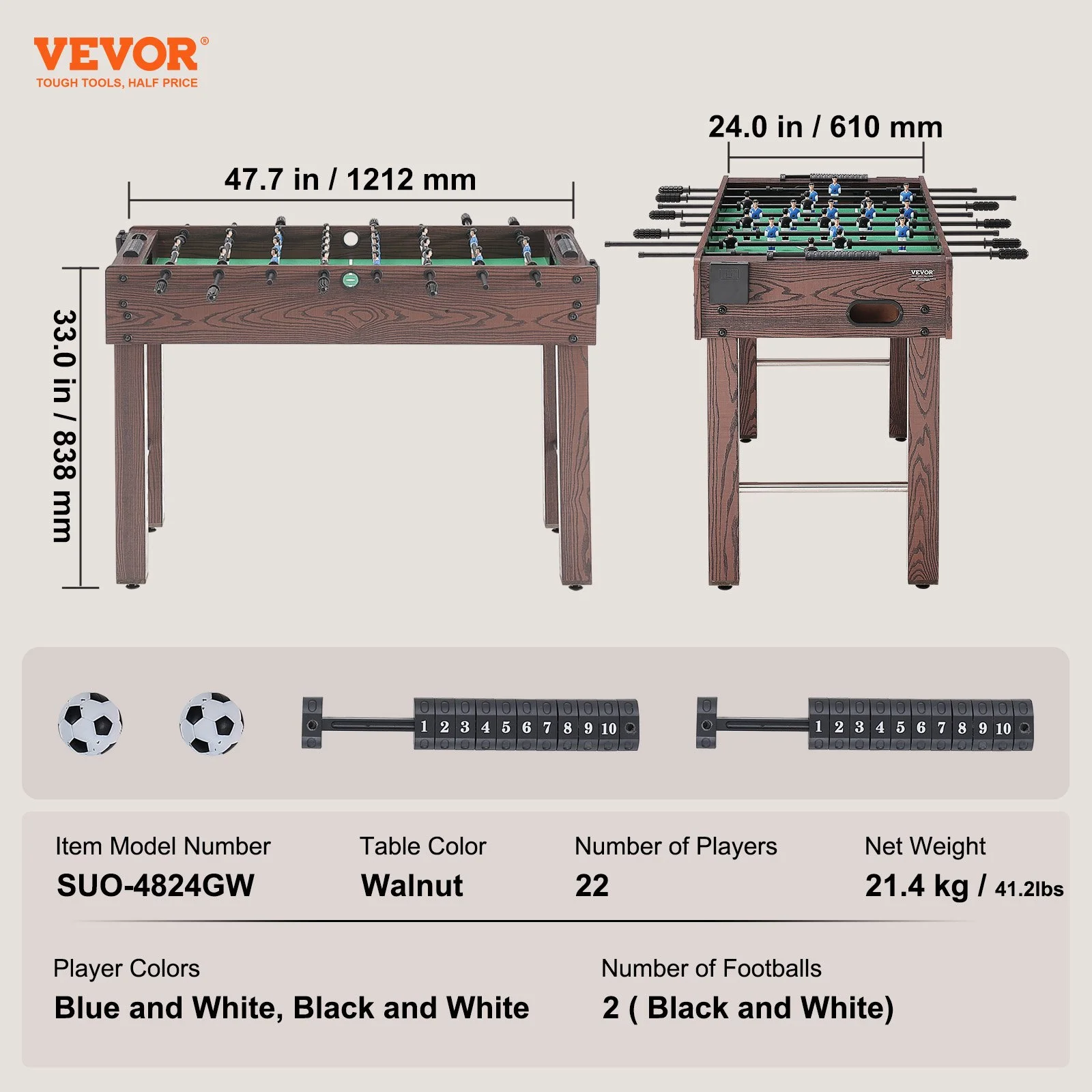 The 48-inch foosball table is made of high-quality medium density fiberboard, durable and mold-resistant. It features 22 players and 2 footballs, finely crafted and odorless. The rods are straight and smooth, ensuring powerful strikes without bending or rusting, exceeding your expectations for a robust and long-lasting table.