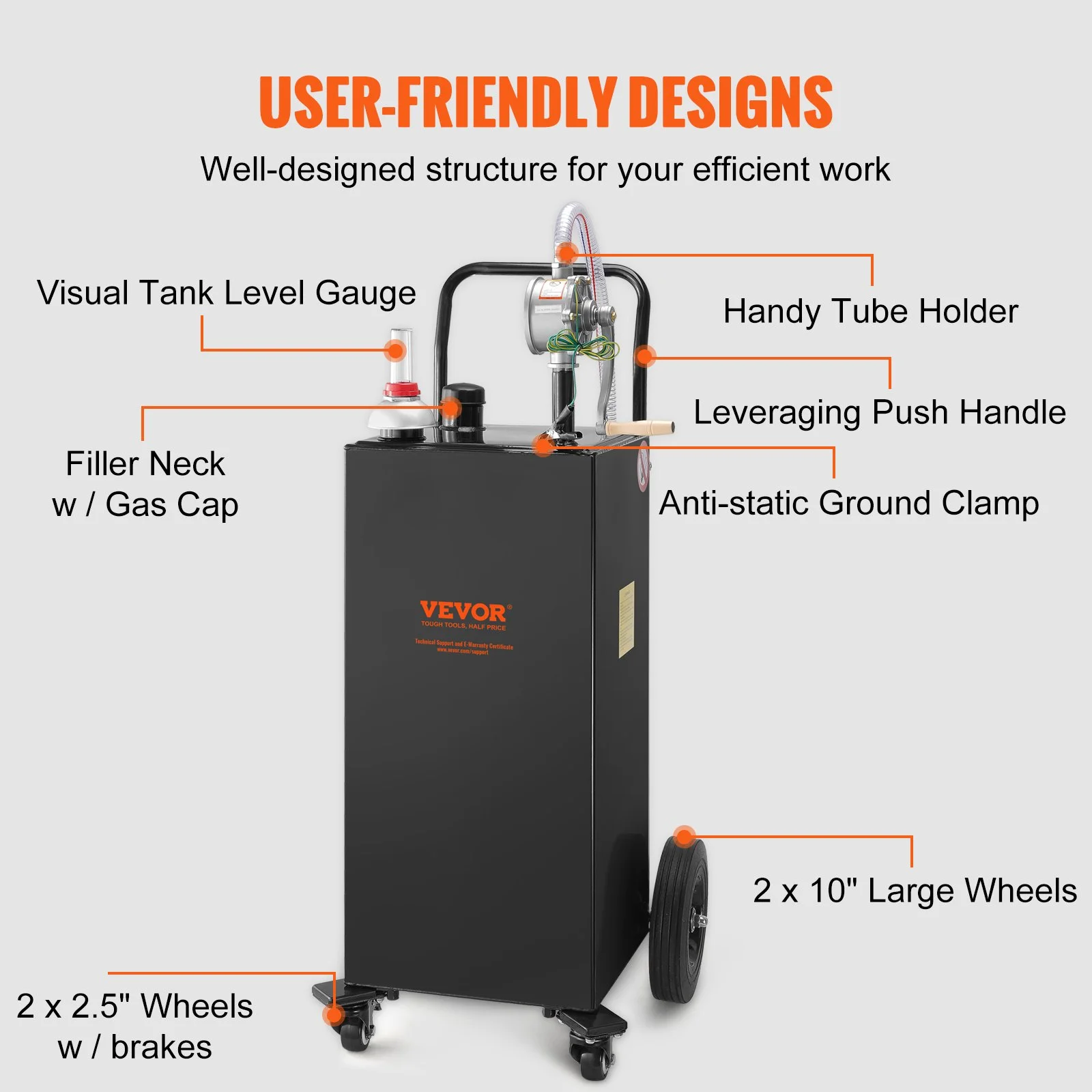 The 30-gallon fuel caddy allows for easy maneuverability, letting you bring the fuel directly to where you need it, making dispensing quick and painless. Our fuel storage tank can securely hold gasoline, kerosene, or diesel. It's the perfect choice for auto repair, farms, lawns and gardens, marine uses and more.
