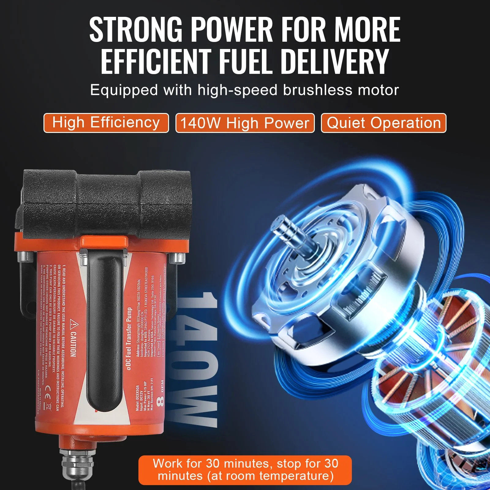 Equipped with a 1/5 HP high-speed brush-less motor, this fuel transfer pump delivers fuel at up to 8 GPM, with a maximum lift of 30 ft and a suction lift of 7 ft. It can take as little as 4 minutes to fill up a car with a full tank of gas. This pump offers a reliable and speedy fuel delivery experience, making your tasks easier and more convenient.