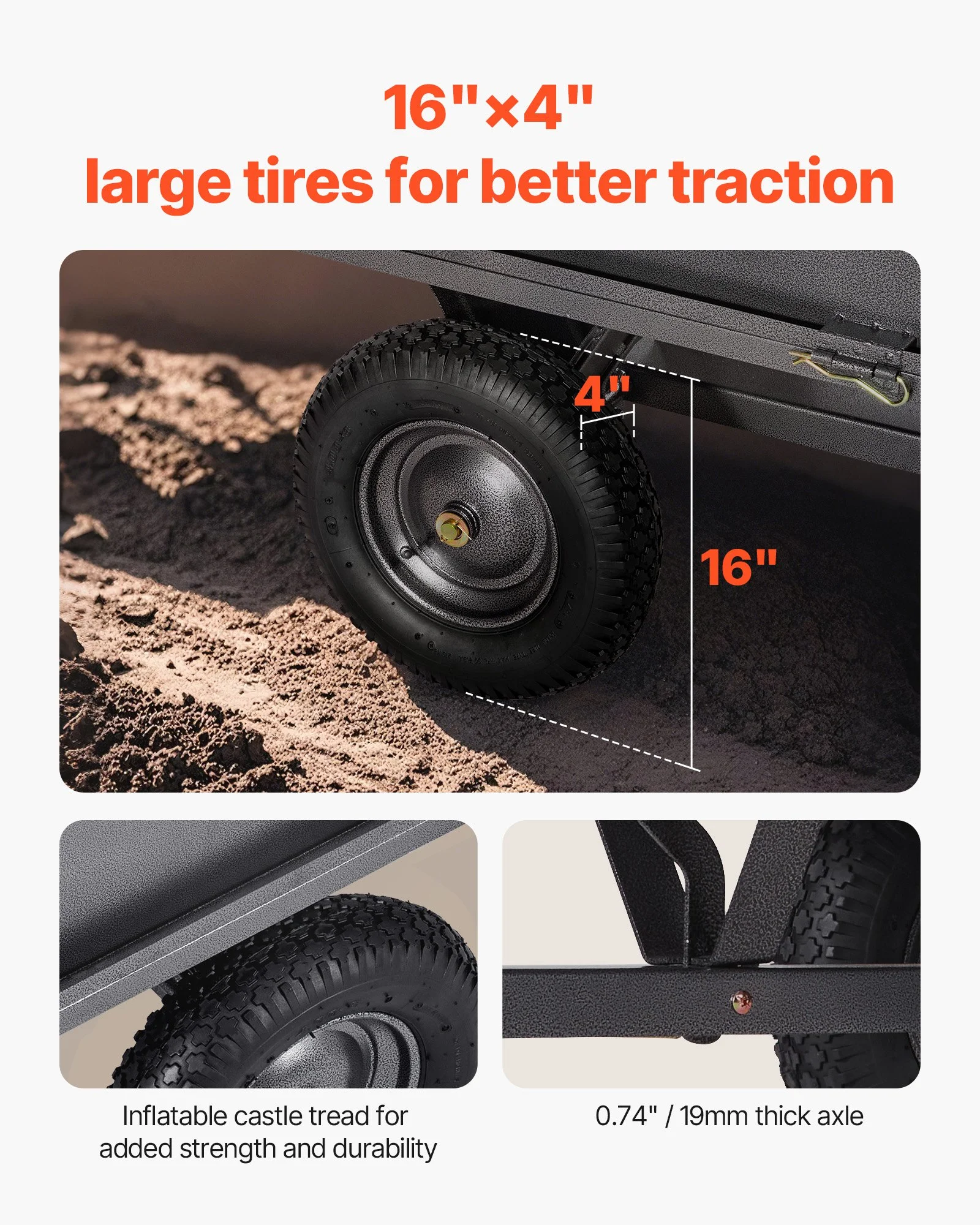 Featuring 16"×4" large pneumatic tires, this utility trailer for lawnmower offers excellent traction and strength. It ensures smooth movement across uneven surfaces like grass, mud, sand, and gravel, with a thickened powder-coated axle for durability.