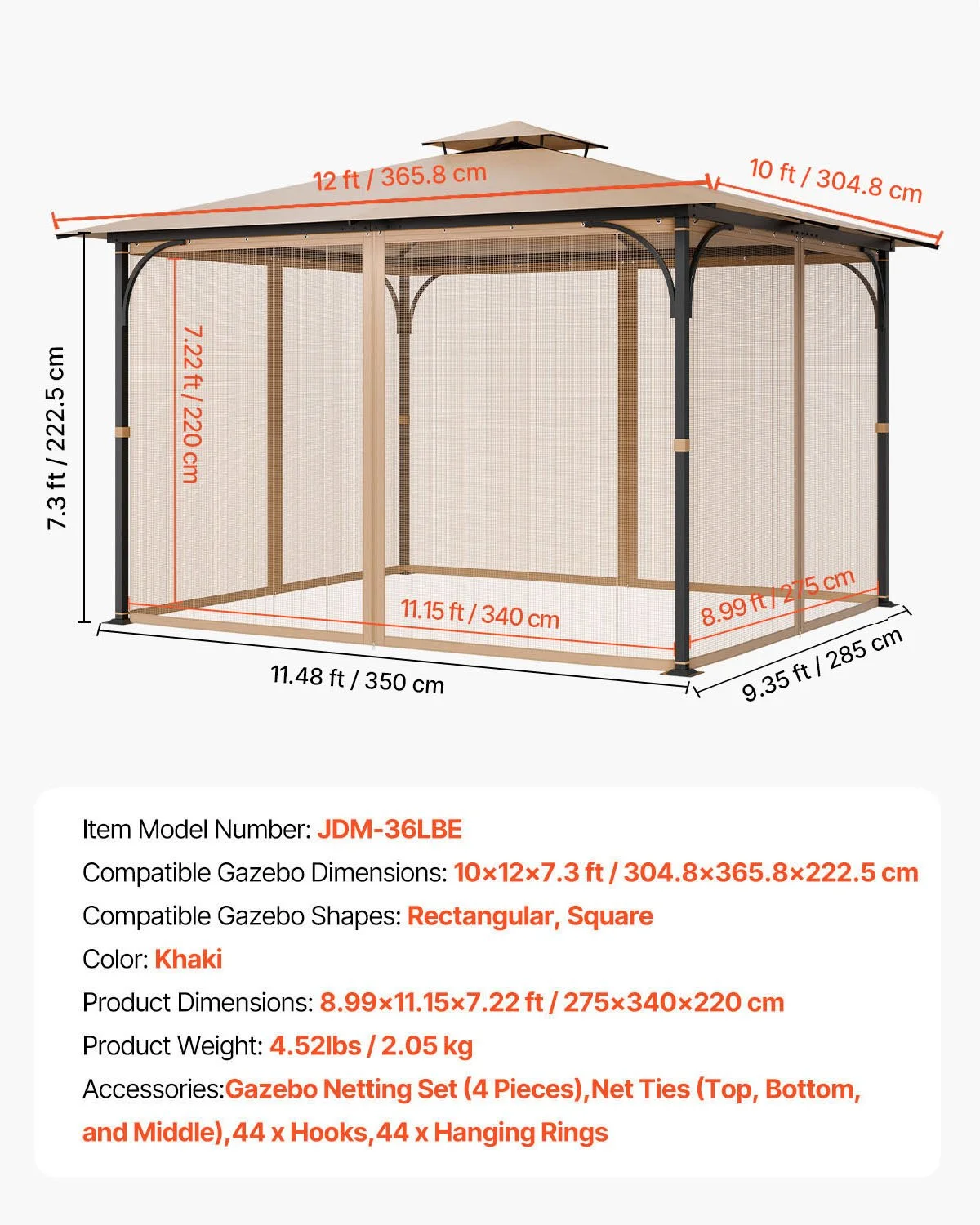 This replacement gazebo netting measures 8.99 (L) x 11.15 (W) x 7.22 (H) ft / 275 x 340 x 220 cm, and is compatible with most 10ft (L) x 12ft (W) x 7.3 ft (H) / 304.8 x 365.8 x 222.5 cm rectangular or square gazebos, including straight-leg canopies, pop-up tents, pavilions, and wrought-iron tents. The net includes four zippered mesh side panels that cover all four sides of the gazebo. Please measure your gazebo before purchase.