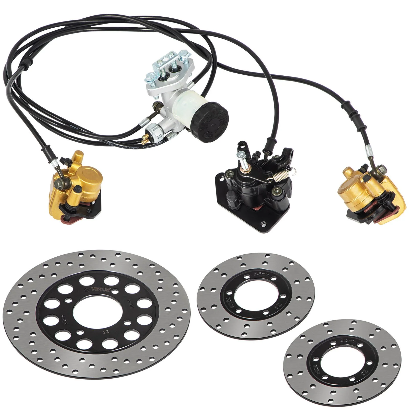 The go-kart hydraulic brake assembly includes a master cylinder, three brake calipers, three brake hoses, and brand-new brake discs. It comes ready to install, pressurized with brake fluid. Do not worry about bleeding the brakes.