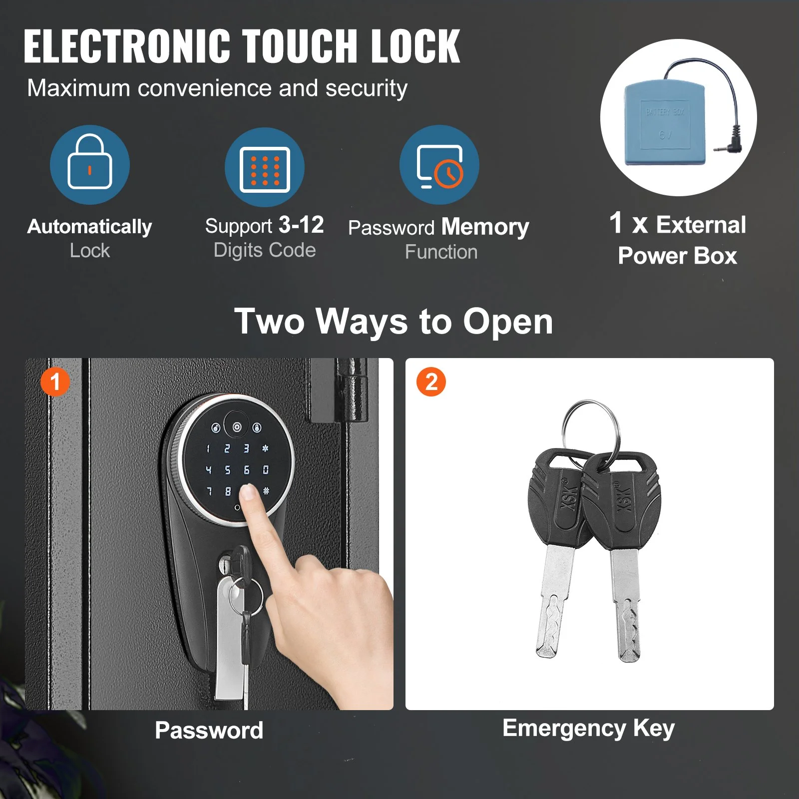 VEVOR long gun safe features a smart 9-digit touchscreen combination lock for quick and secure access within one second. You can register up to 3-12 fingerprints for easy entry. In emergencies, the safe includes 2 emergency keys and an external charging box, ensuring you're never without power.