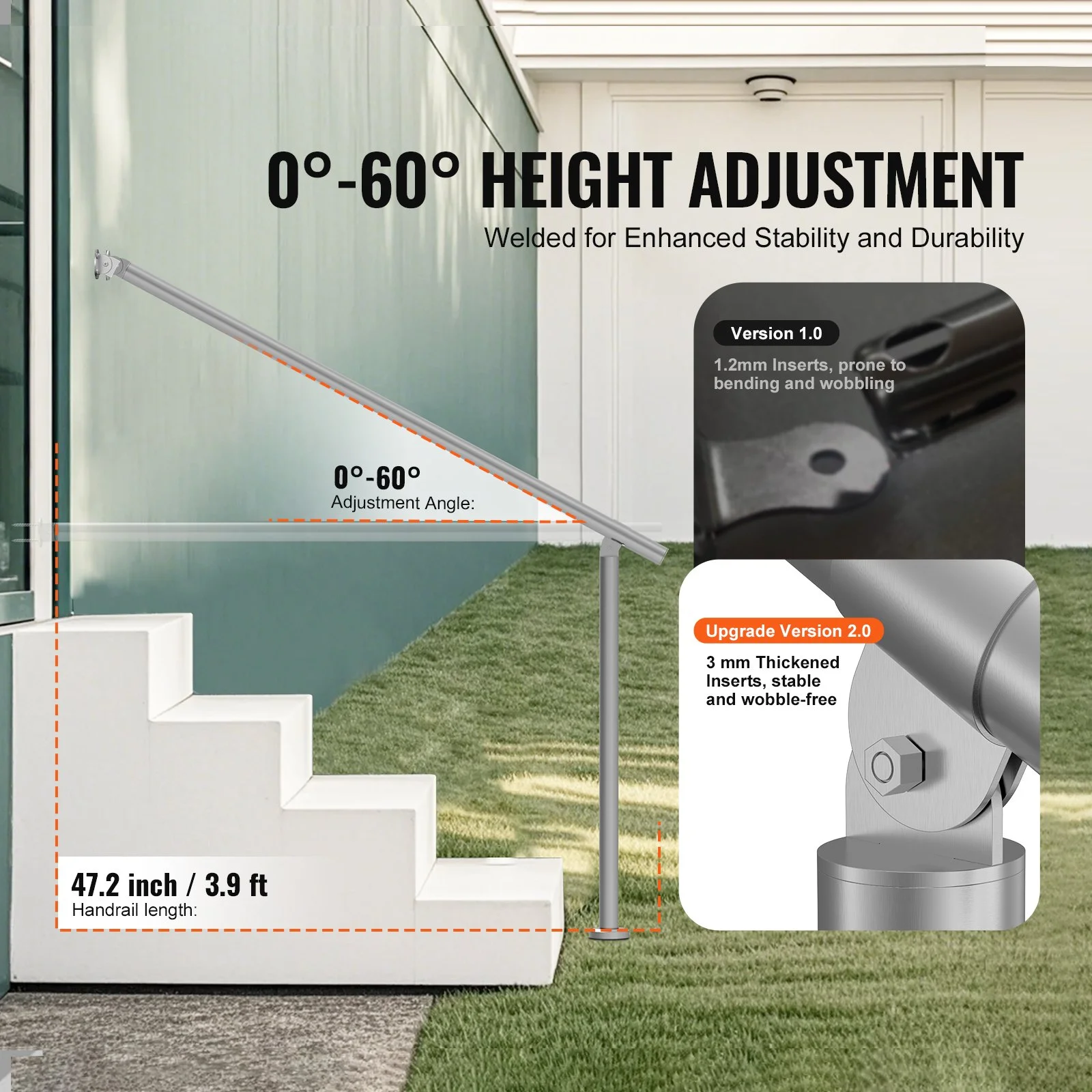The handrail features a transition range from 0 to 60 degrees, making it suitable for most doorsteps, garage entrances, garden railings, and more. This versatility allows it to fit various stair configurations with ease.