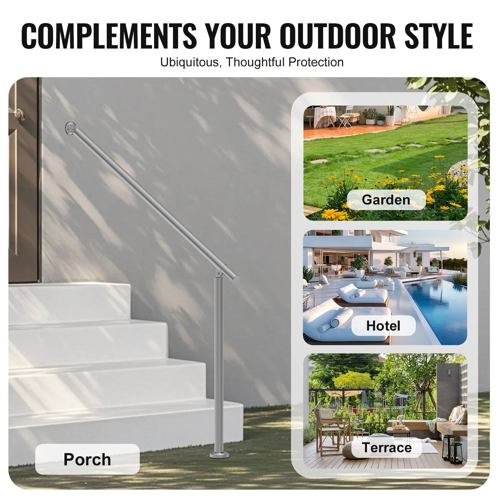 This outdoor stair railing can be installed on concrete, wood floors, tiles, marble, and other solid surfaces. Its unique design complements different stair types, ensuring a stylish and functional addition to your home.