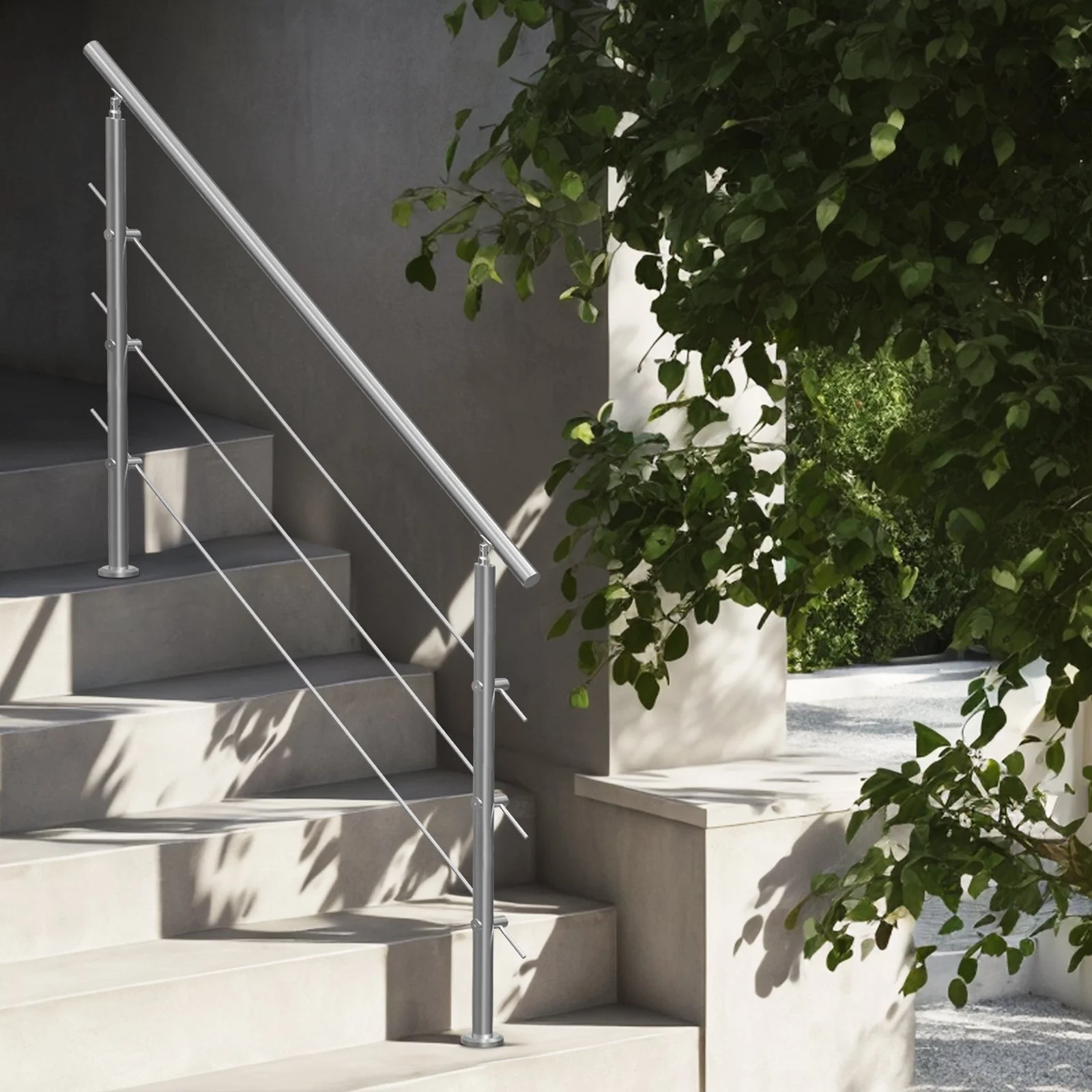 This outdoor stair railing can be installed on concrete, wood floors, tiles, marble, and other solid surfaces. Its unique design complements various stair types, ensuring both functionality and style.