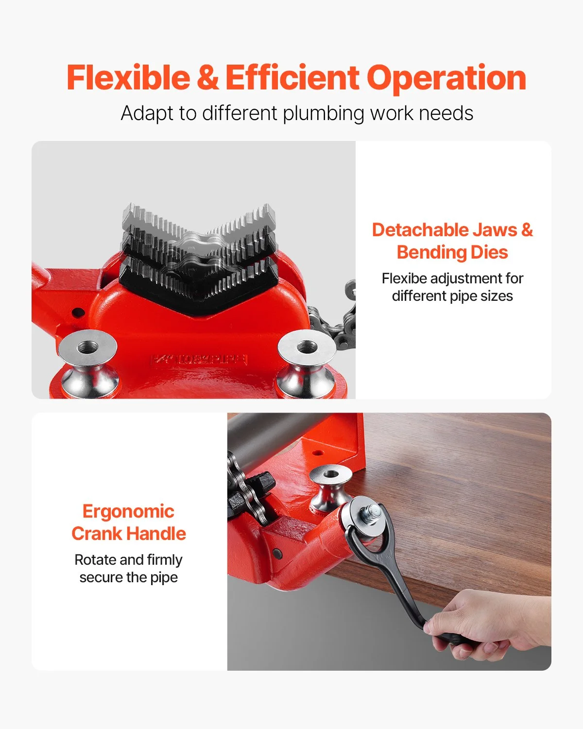 The VEVOR bench chain vice accommodates a wide range of pipe diameters, with a clamping capacity of 1/2" - 8" and a chain length of 34.6-inch. Two included bending dies enable precise bending of pipes.