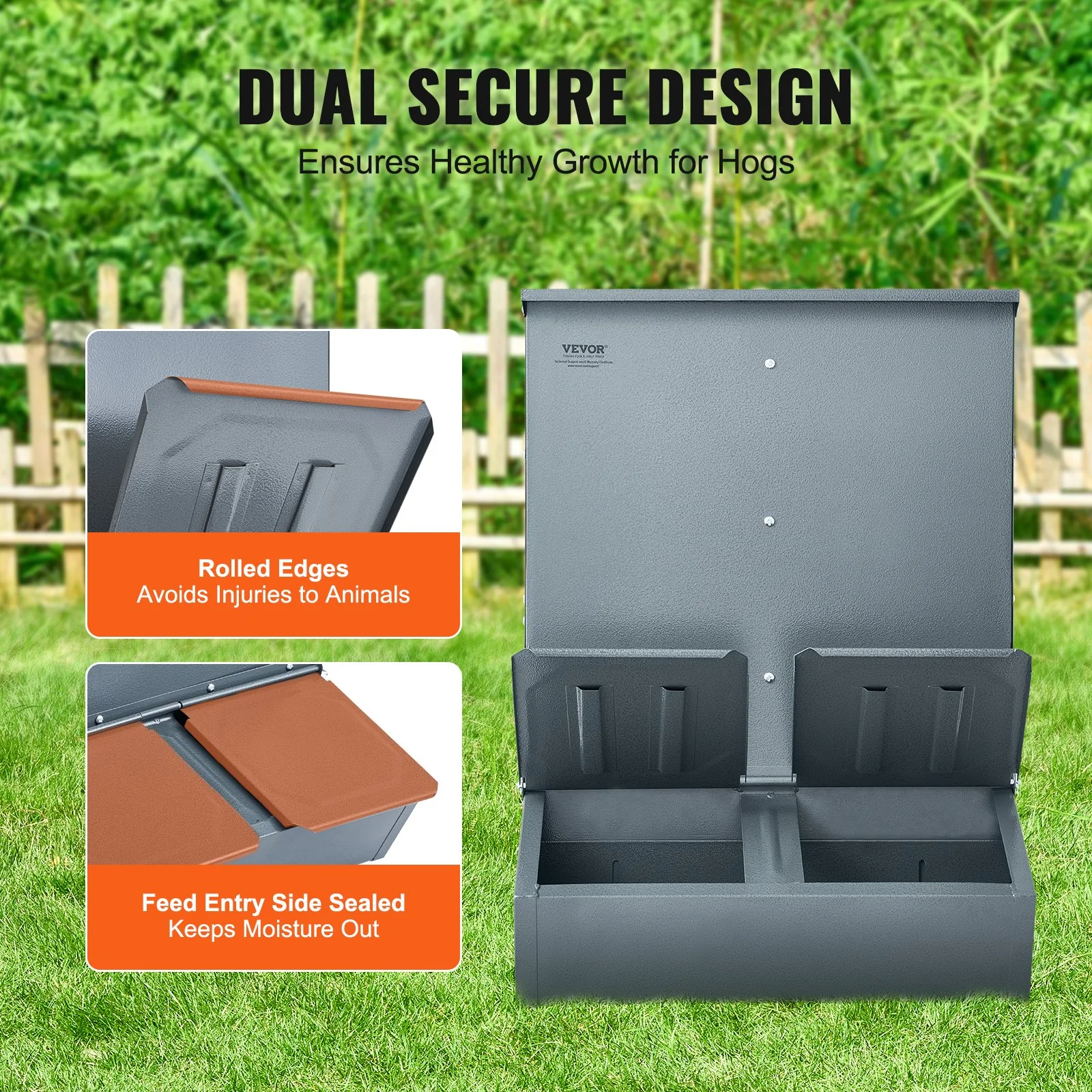 Our hog feeder comes with metal door that keeps feed dry and ensures pigs enjoy fresh food.