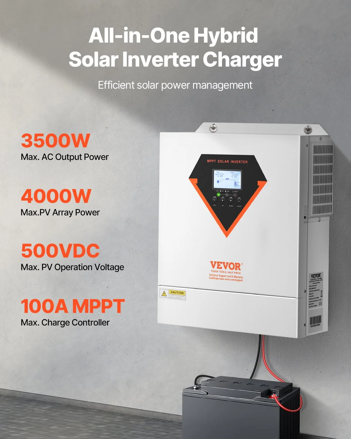 Equipped with an advanced MPPT solar charge controller, this hybrid solar power inverter supports up to 100A battery charging, boosting solar energy conversion efficiency to 94%. It supports a maximum power of 4000W and a voltage range from 60V to 500V DC, making it highly compatible with a wide range of solar systems