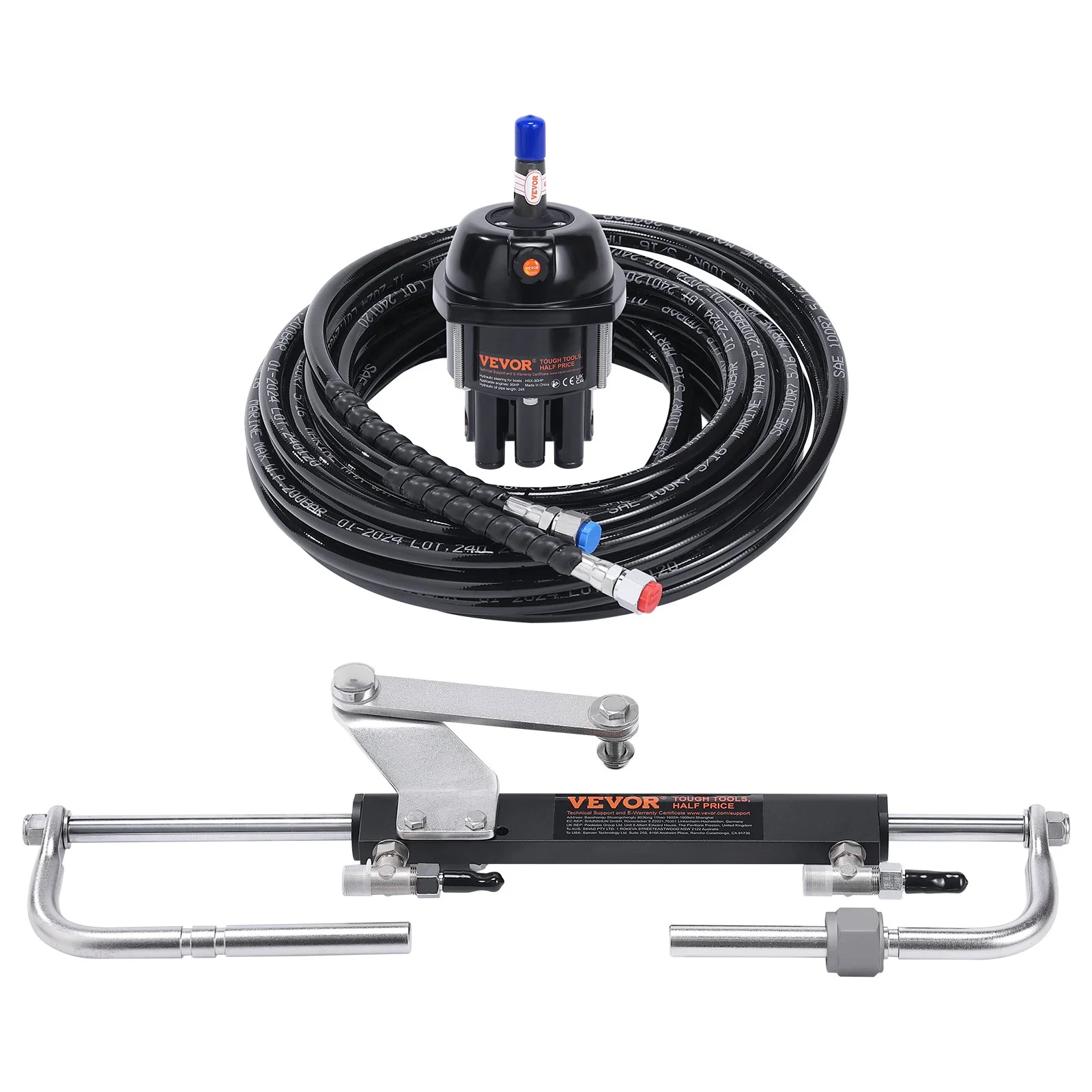 Our 90 HP boat hydraulic steering system includes a hydraulic steering cylinder, a low-friction hydraulic pump, two 24ft high-pressure hoses, and a complete set of accessories. It's the perfect replacement for aging or damaged hydraulic steering systems. Enjoy unmatched control and stability on your maritime journeys_